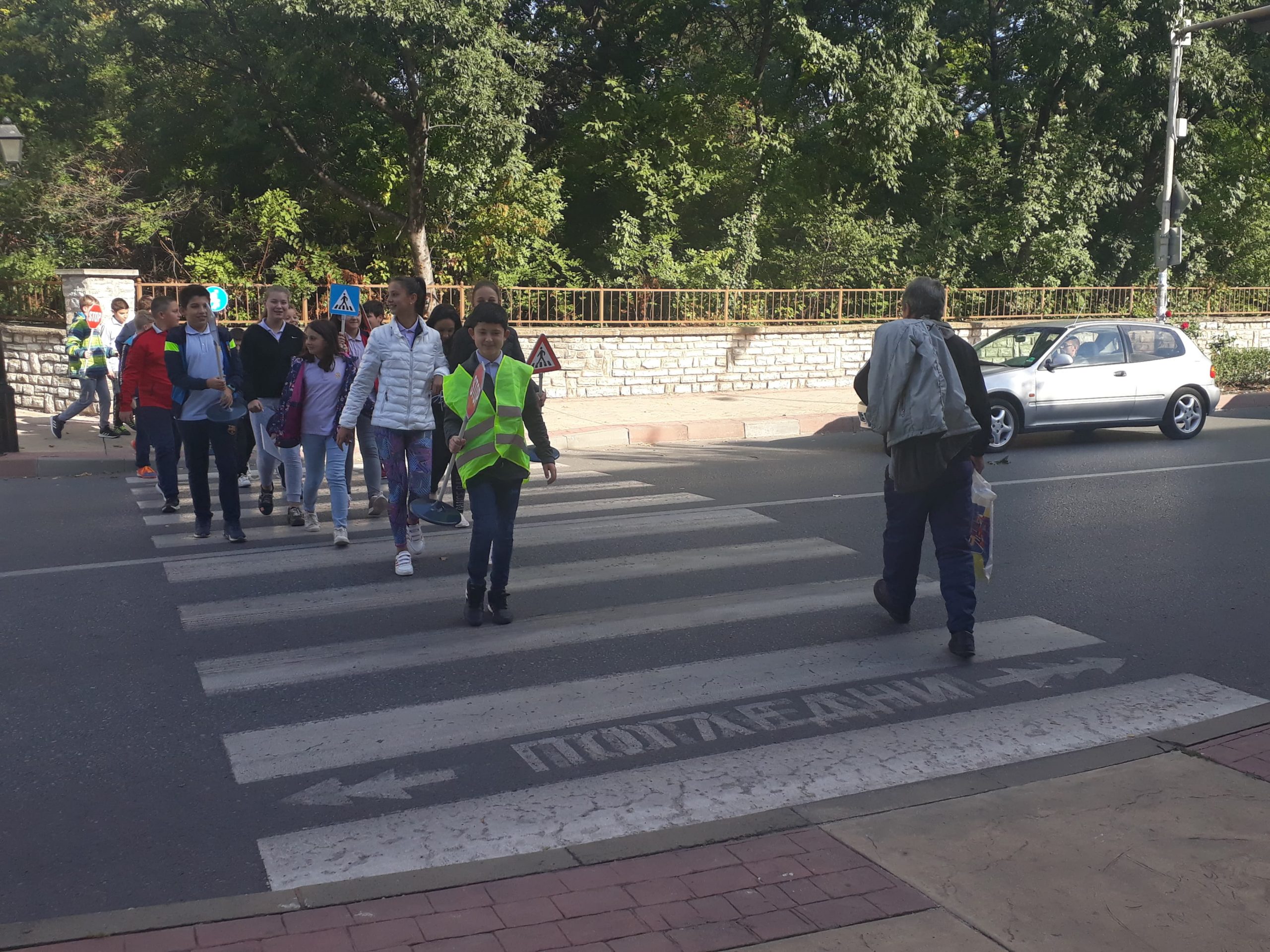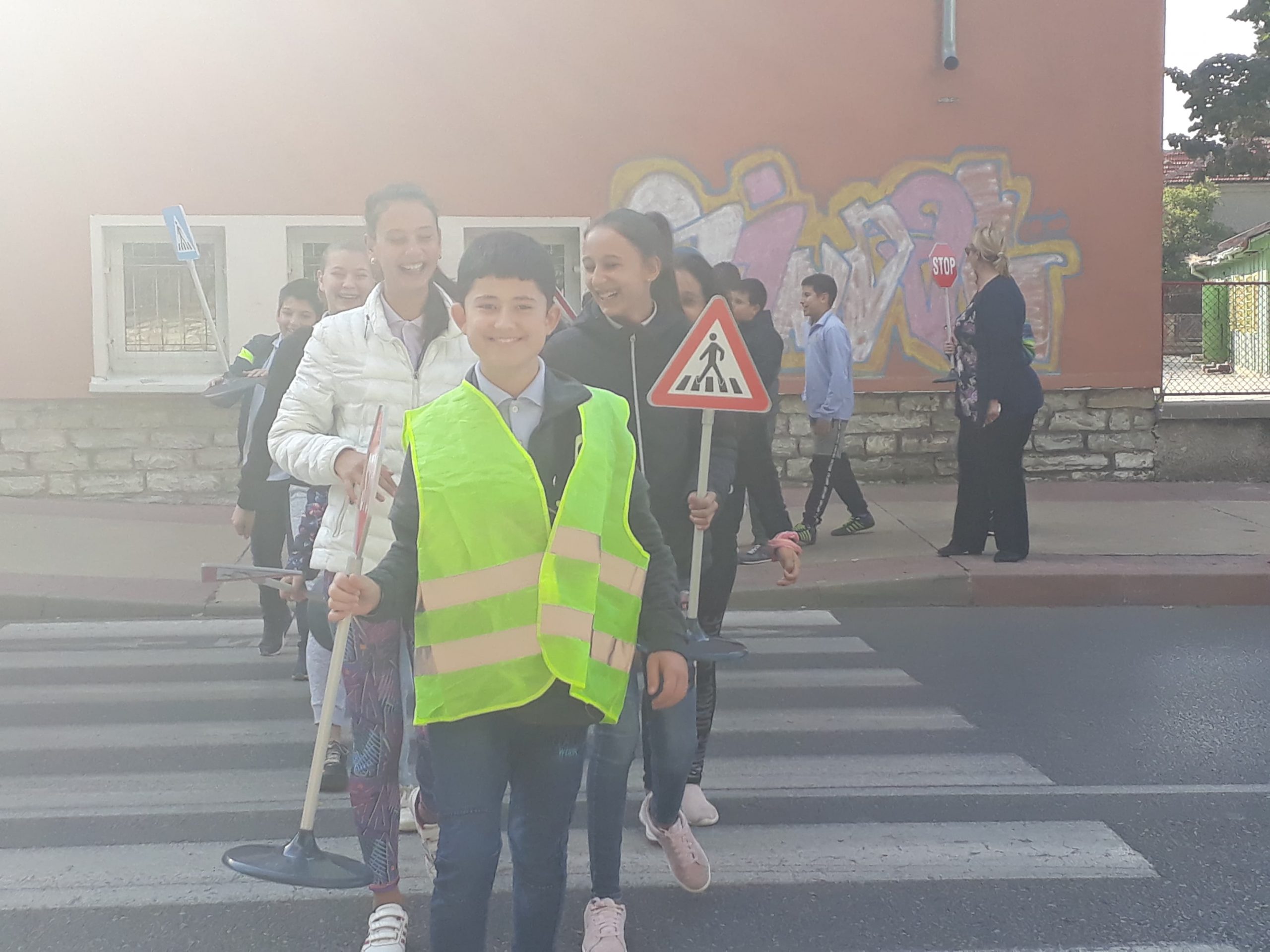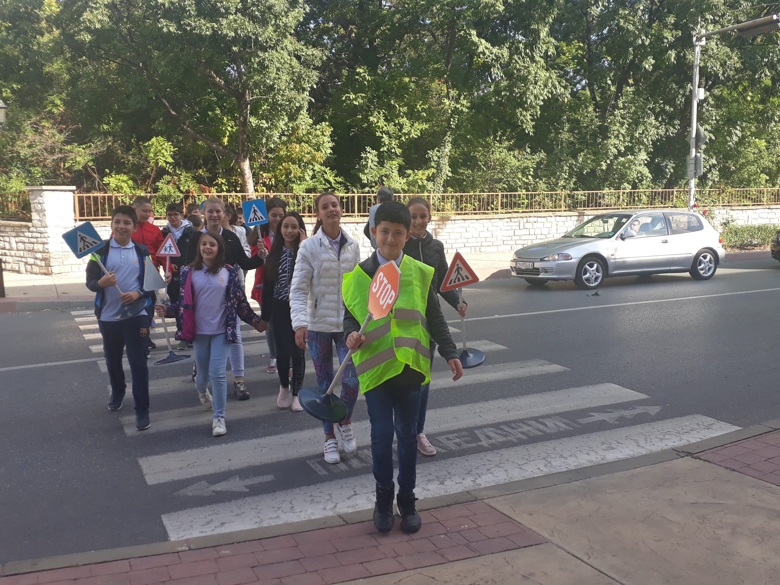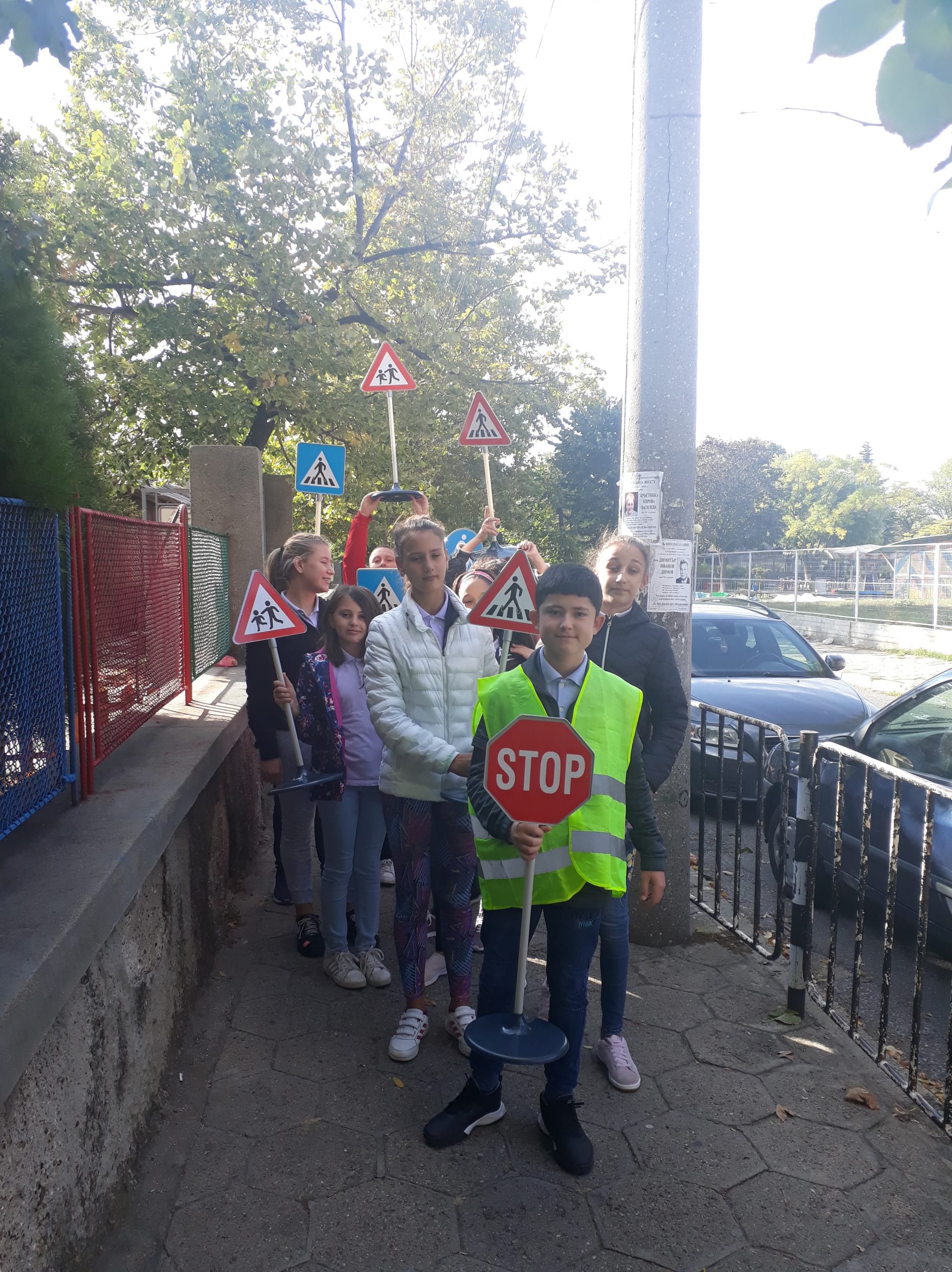 На 11.10.2019 г. ученици от VI в клас на ОУ “Димитър Петров” – Сливен осъществиха флашмоб на пешеходната пътека до училището. Целта на инициативата беше да се затвърдят знанията им по Безопасно движение по пътищата и на практика да видят реакция на водача и спирачен път, понятия, които изучават в часовете по задължителна и избираема подготовка по предмета “Човекът и природата”. Занятието имаше и възпитателен характер спрямо водачите на превозни средства, които трябва да шофират с безопасна скорост, така че да могат да реагират своевременно при съществуваща опасност на пътя. Учениците бяха “въоръжени” с пътни знаци “Стоп” , “Внимание! Пресичащо дете” и обозначителни сигнални жилетки. Бяха свидетели на съобразителност и внимание от страна на водачите на моторни превозни средства.