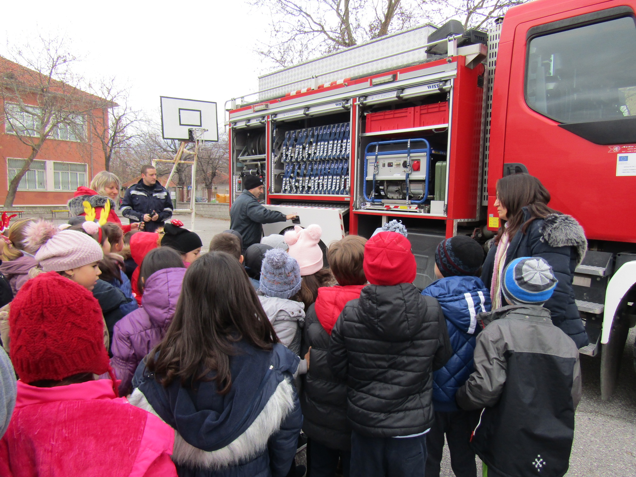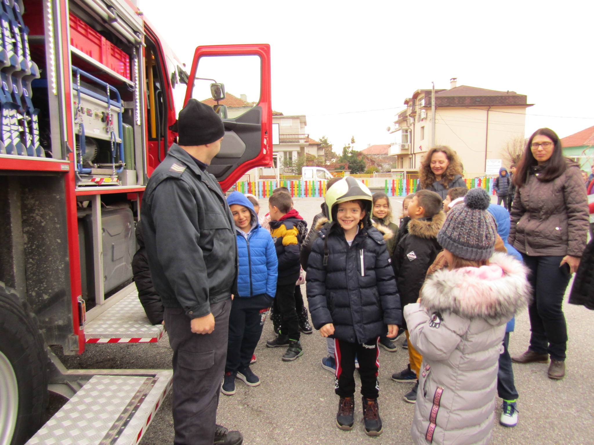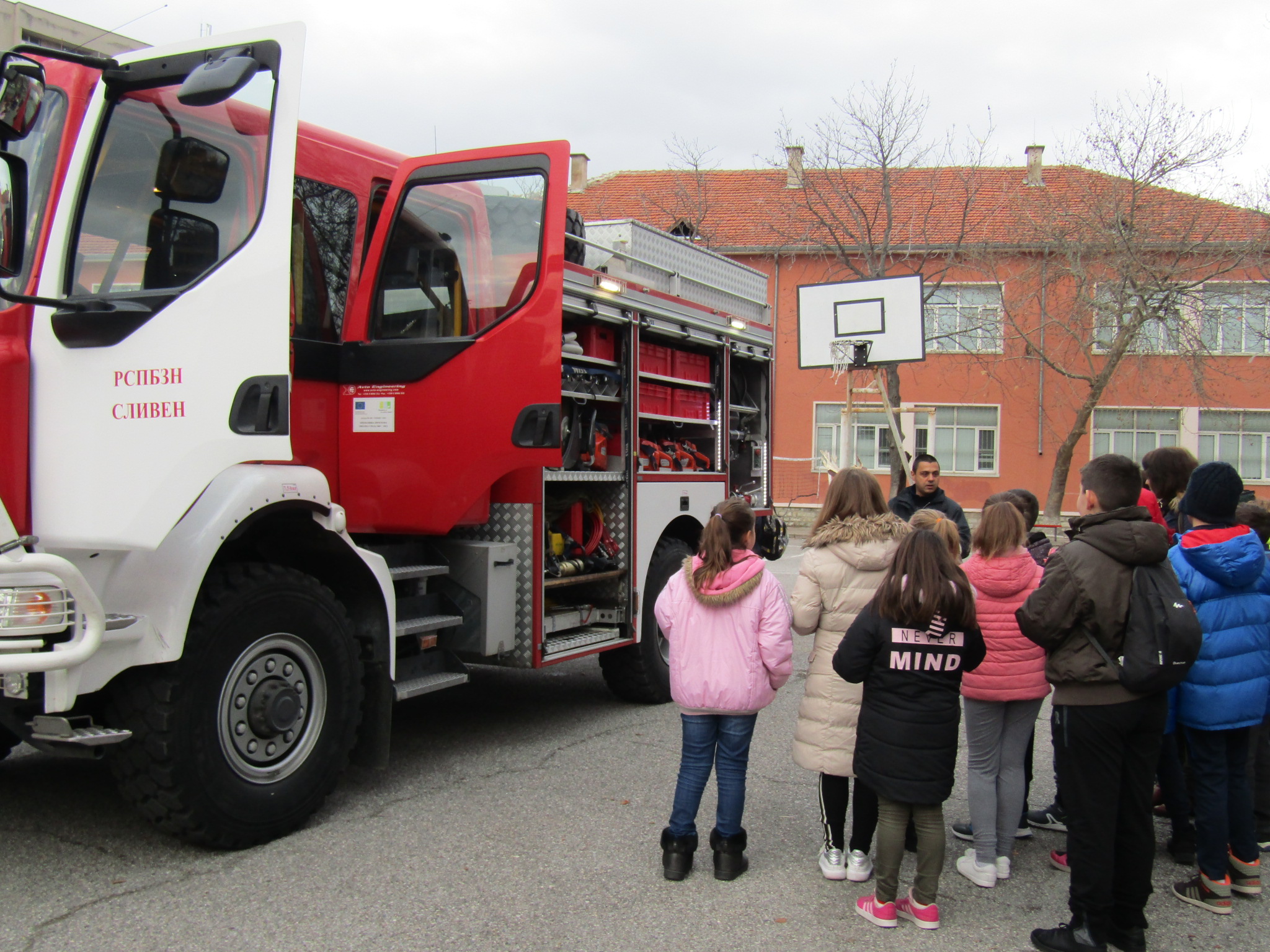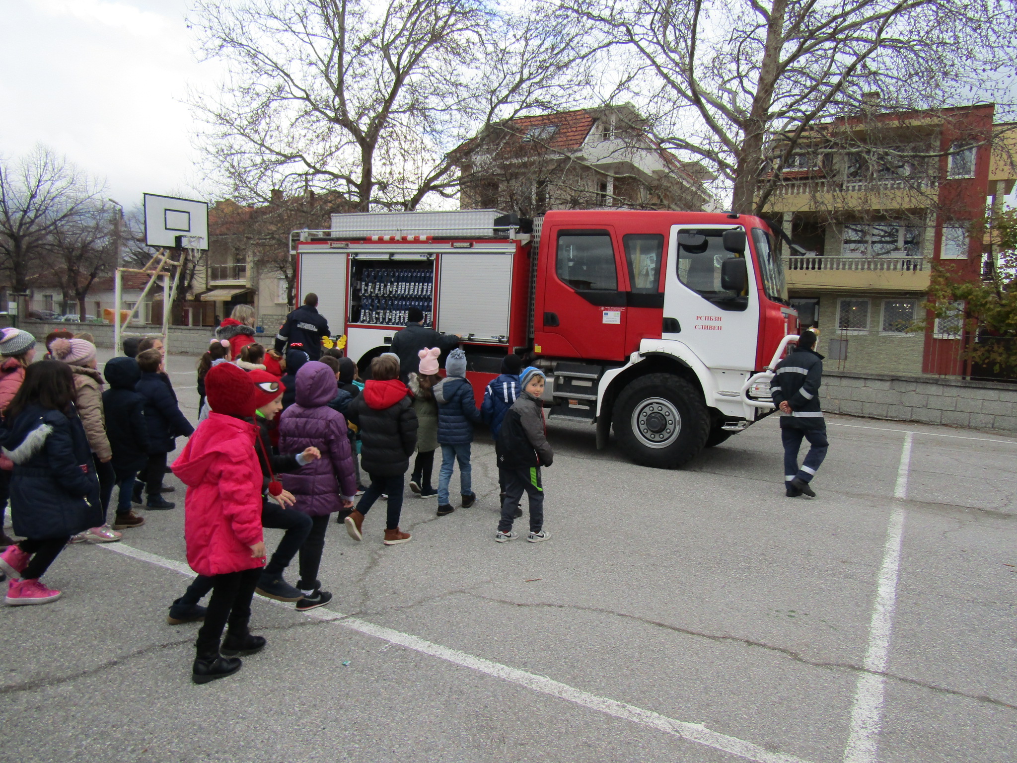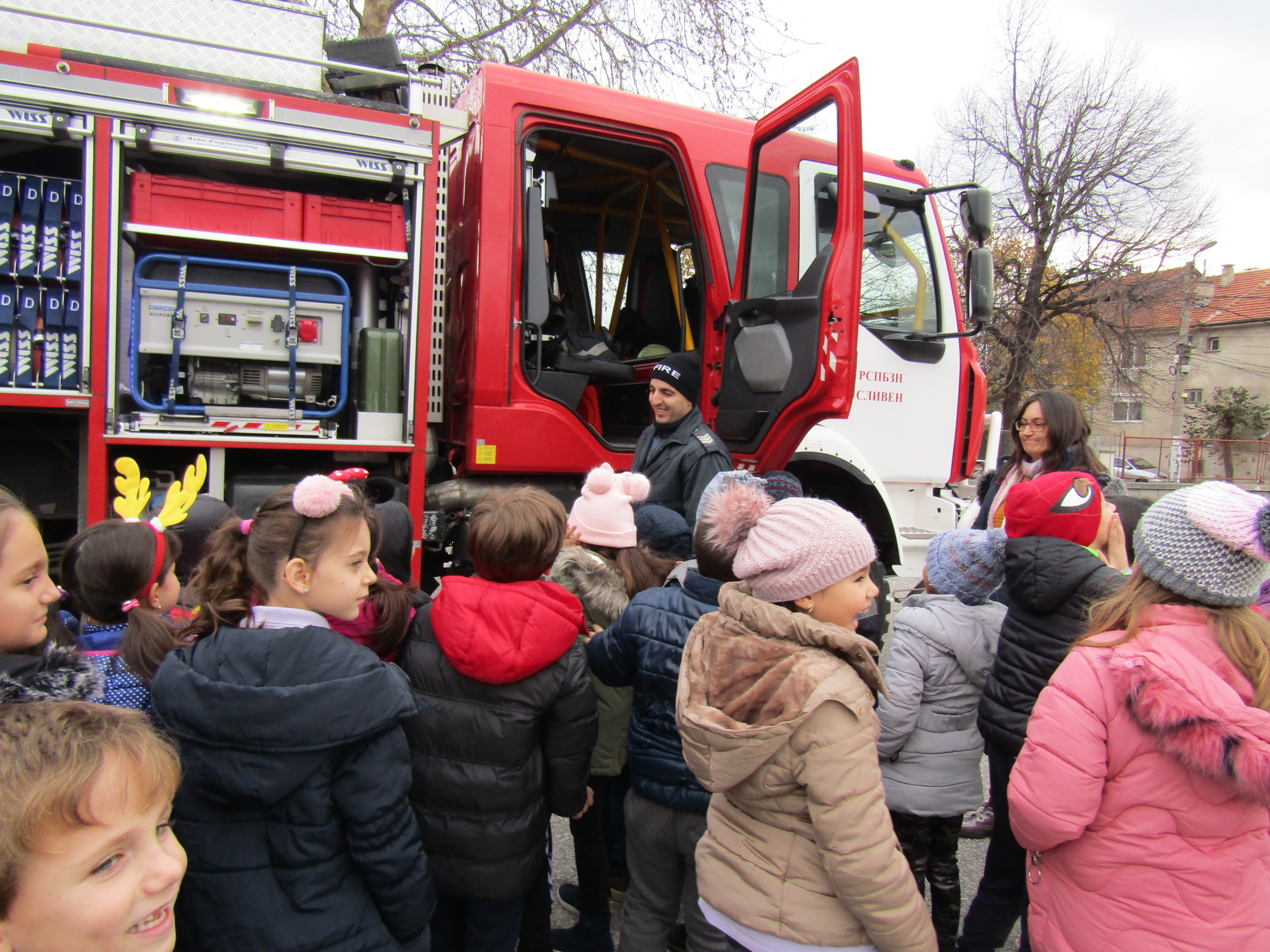Днес, 11.12.2019г., служители от Районна служба пожарна безопасност – Сливен гостуваха в ОУ “Димитър Петров”. Те направиха открита демонстрация на техника и оборудване на пожарната кола. Проведоха обучение по пожарна безопасност по време на есенно-зимния сезон с учениците от първи клас и им дадоха ценни съвети за предпазване от пожари.