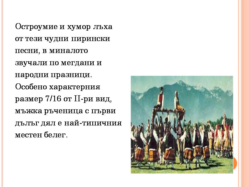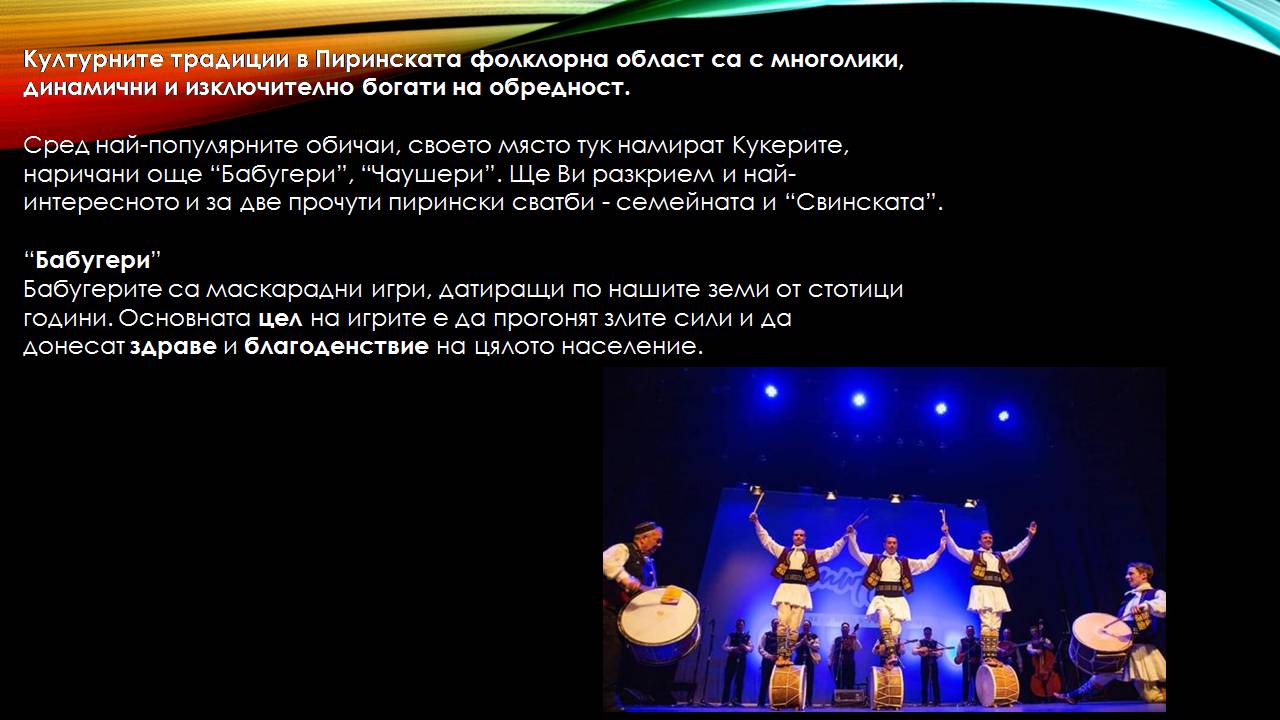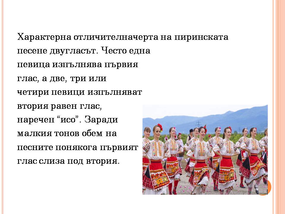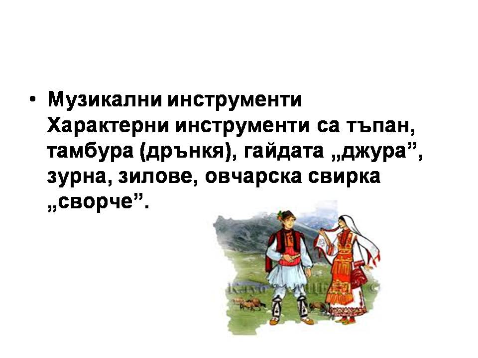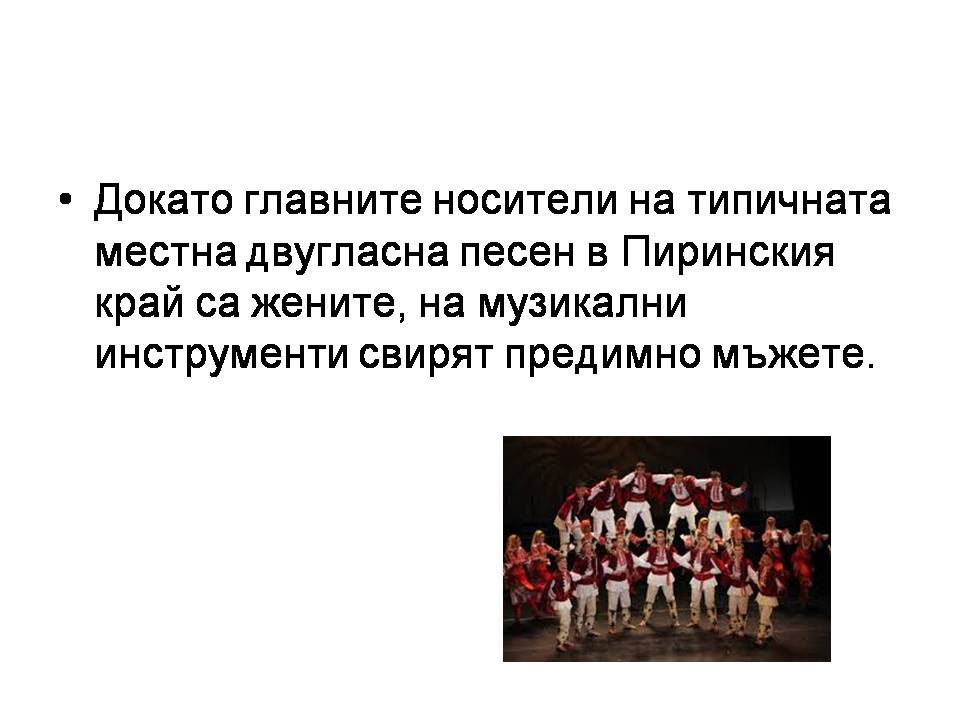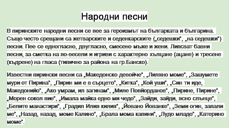 Учениците от V “в” клас изготвиха презентации по музика на тема “Пиринска фолклорна област”. В работата им се разкрива богатството от багри, песни и танци от този регион на България.