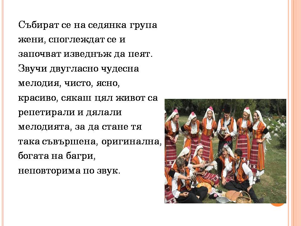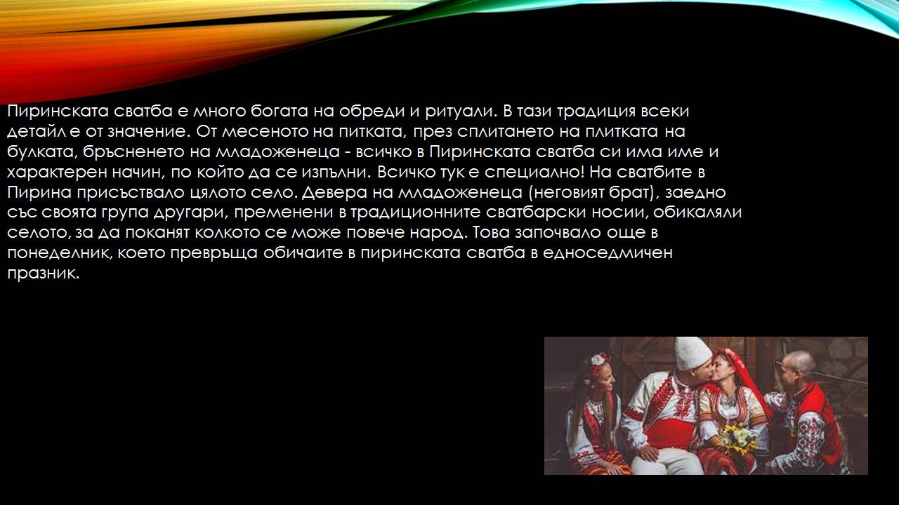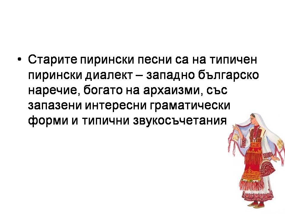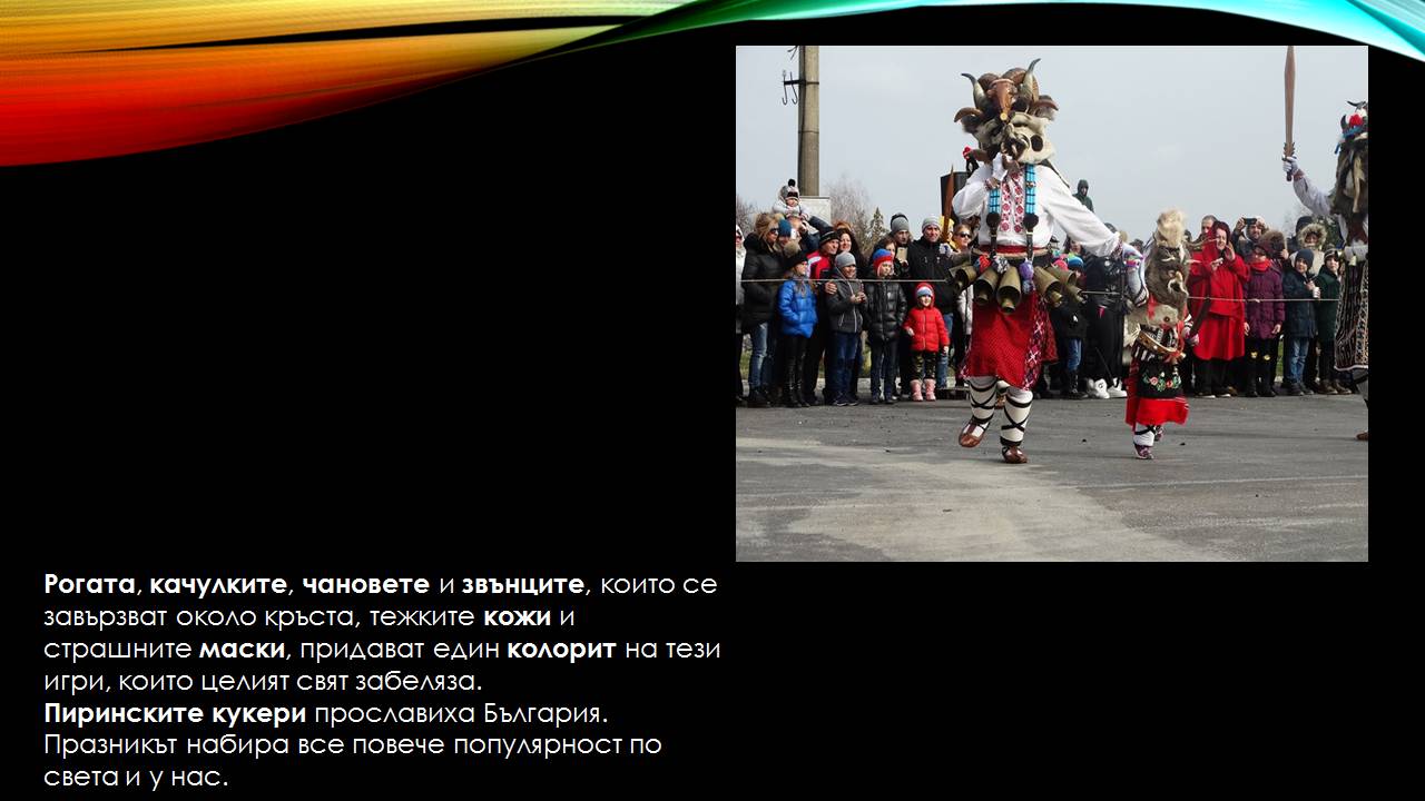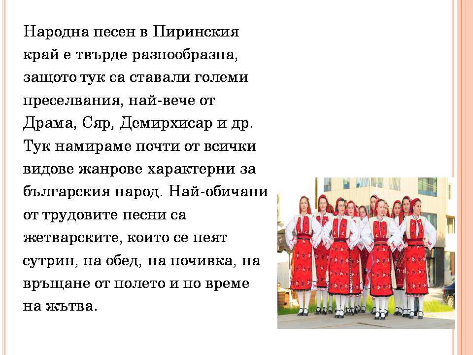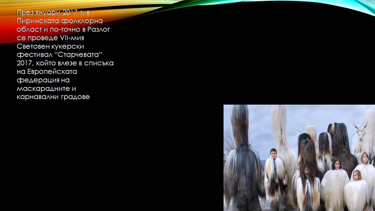 Учениците от V “в” клас изготвиха презентации по музика на тема “Пиринска фолклорна област”. В работата им се разкрива богатството от багри, песни и танци от този регион на България.