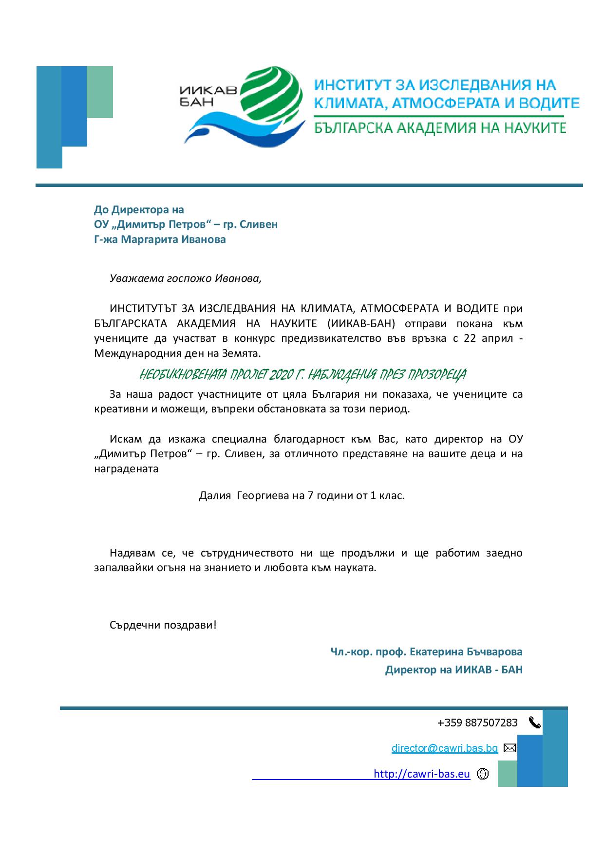 Ръководството на ОУ “Димитър Петров” поздравява Далия Георгиева от I а клас за наградата в конкурса на ИИКАВ – БАН “НЕОБИКНОВЕНАТА ПРОЛЕТ 2020 Г. НАБЛЮДЕНИЯ ПРЕЗ ПРОЗОРЕЦА” в категорията “Най-малък участник”.