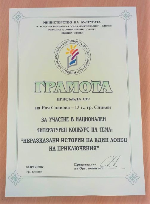 Рая Славова от VII”а” клас бе наградена с грамота от Регионалната библиотека “Сава Доброплодни” в Сливен за участието си в Националния литературен конкурс на тема “Неразказани истории на един ловец на приключения”.