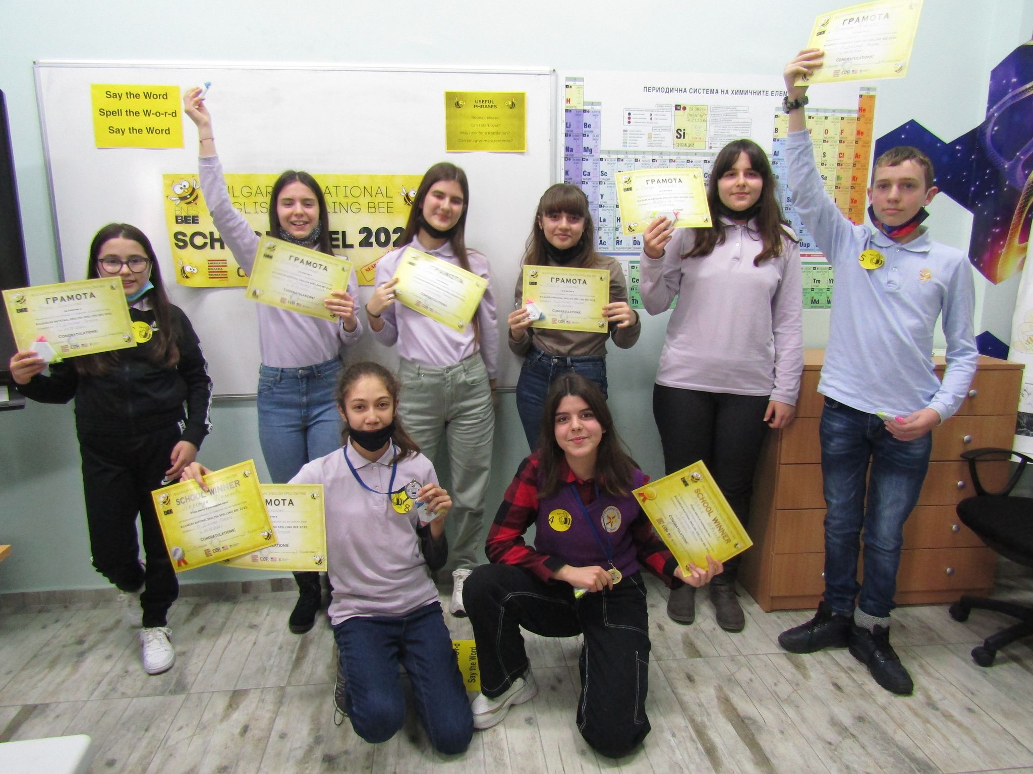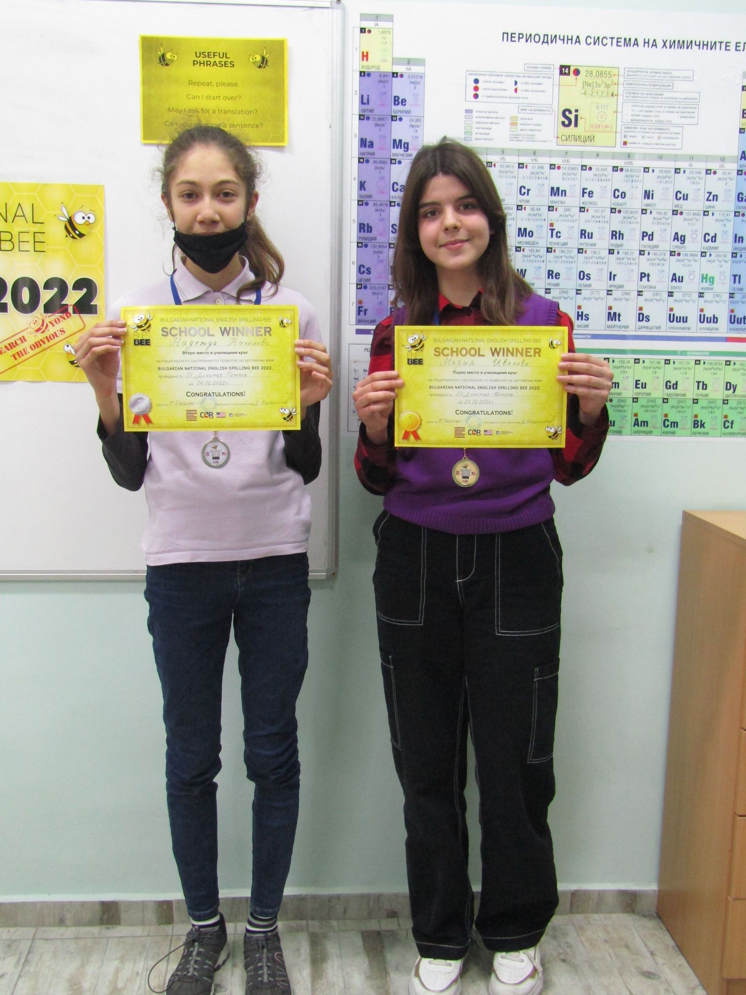 Мария Иванова от VII “A” клас се класира на първо място в училищния кръг, който се проведе на 24.02.2022 г. Тя спелува правилно думата „shamrock” и победи Надежда Николова от VII “A” клас, която остана втора. И двете ученички имат право да участват в регионалното състезание, което ще се проведе на 26 март 2022 г. Националният кръг на състезанието ще се проведе на 16 април 2022 г. в гр. София.