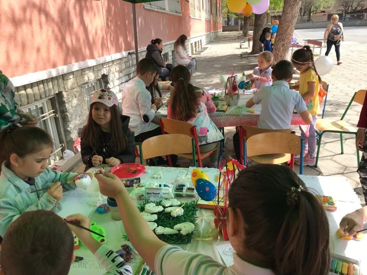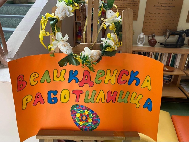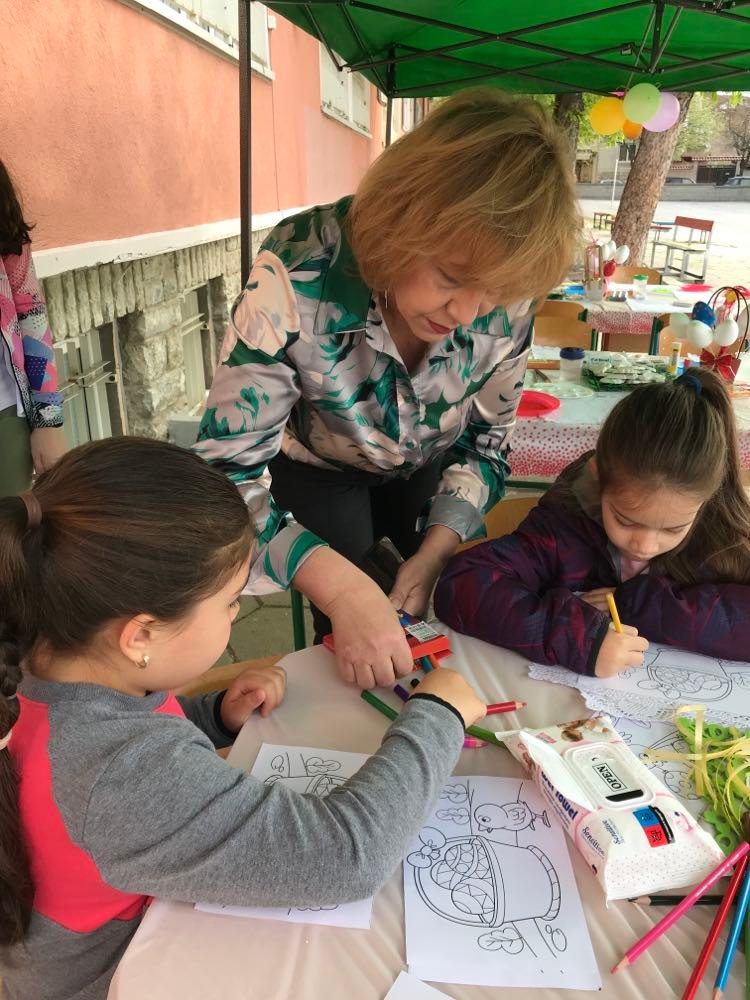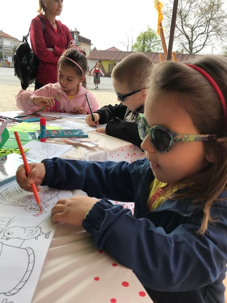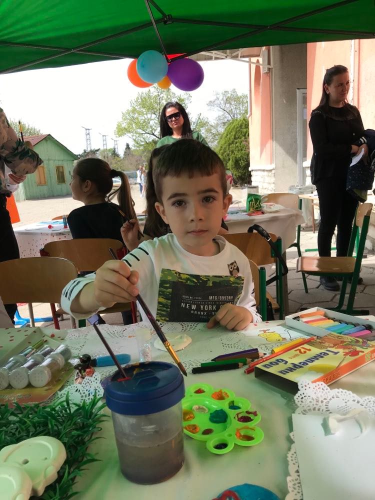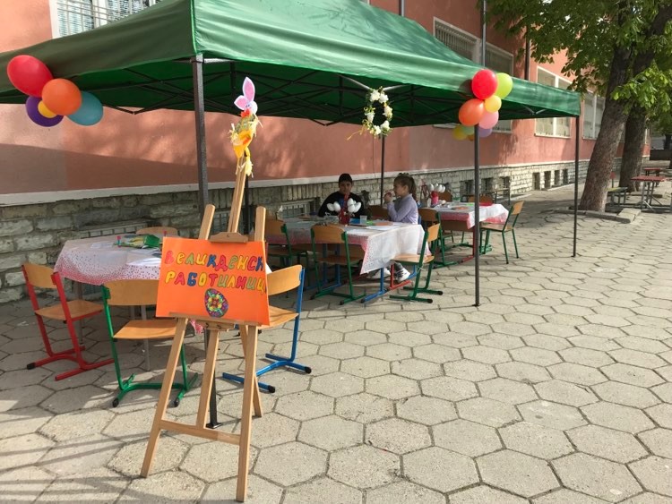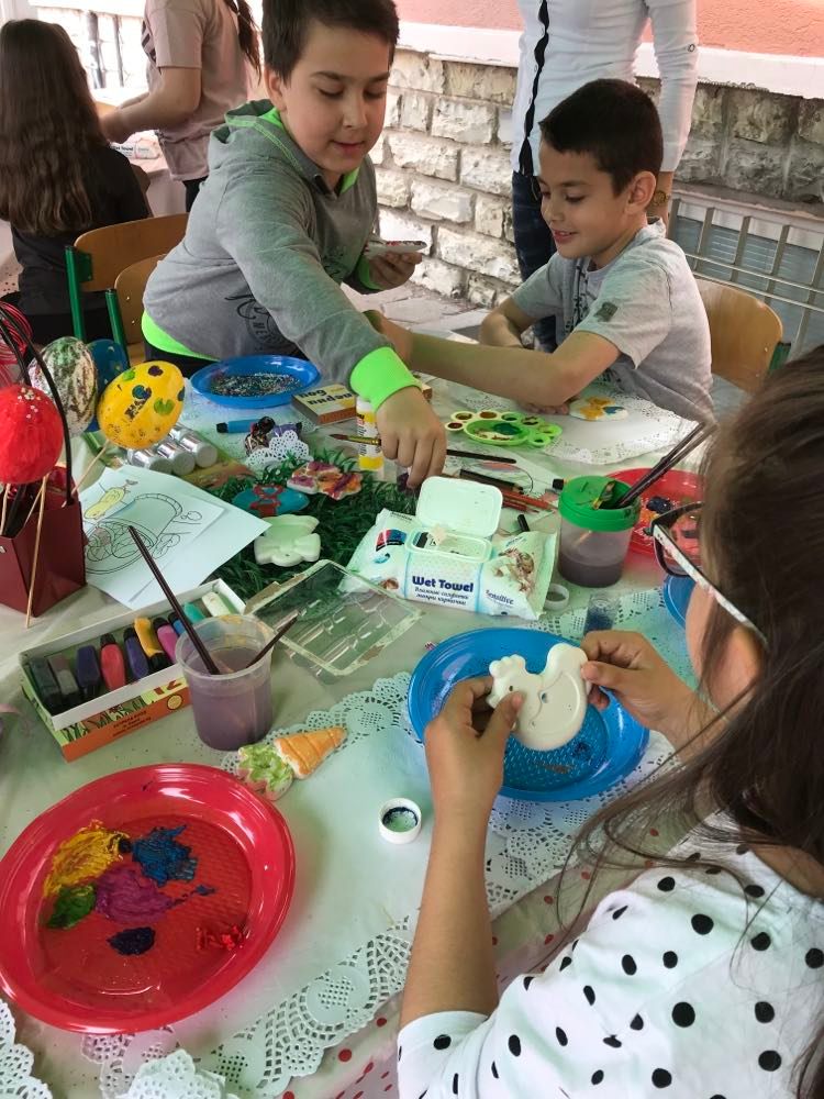 А на двора, под шатрата „ Великденска работилница“, всички заедно се подготвяха за бъдещия празник – оцветяваха яйца, керамични фигури, картинки и различни декорации. Празничен ден, пъстър ден!