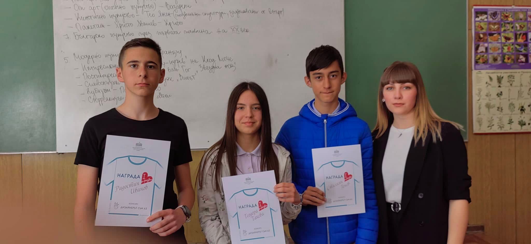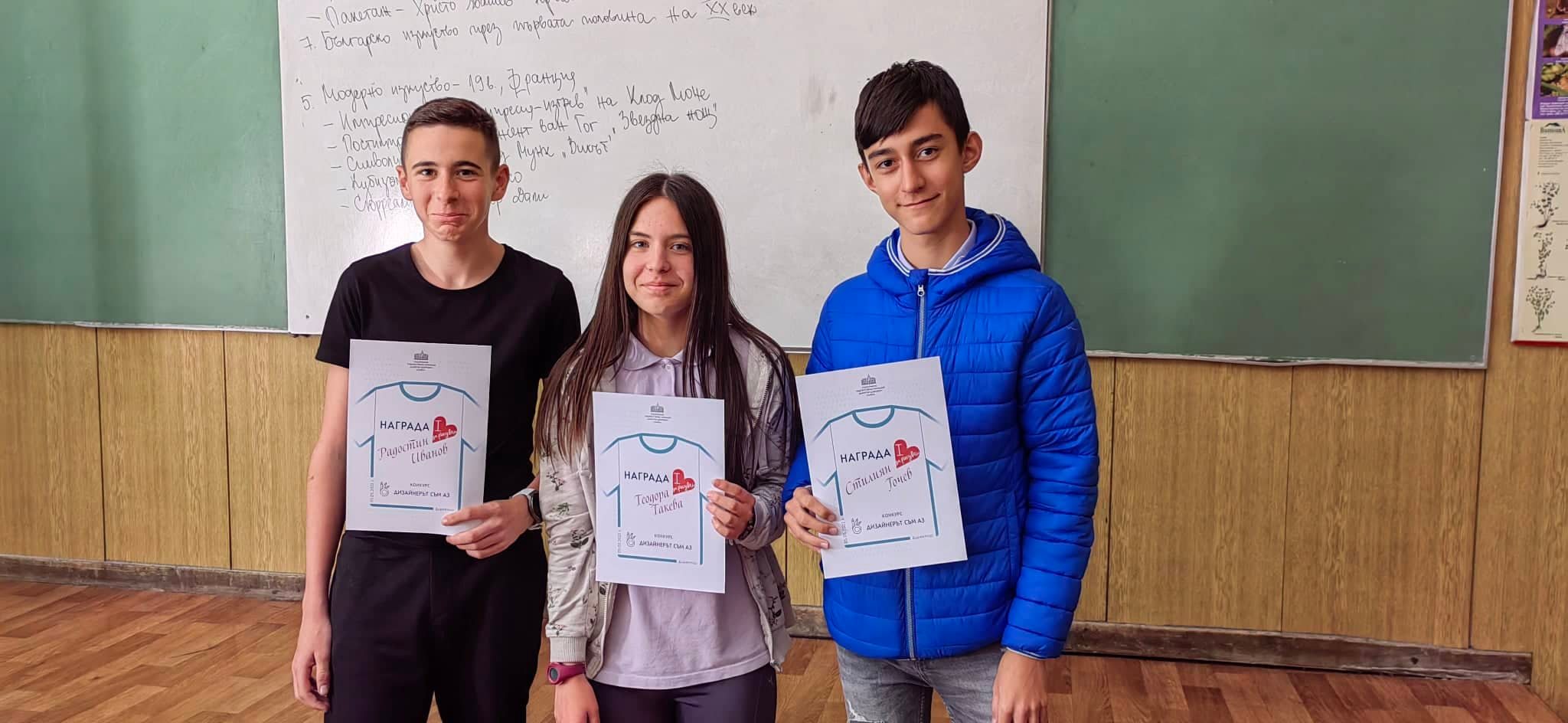 Награждаването с голяма награда се проведе в часовете по изобразително изкуство, а учениците са: Теодора Такева и Радостин Иванов от VII”а”, Стилиан Гочев от VII”б”.