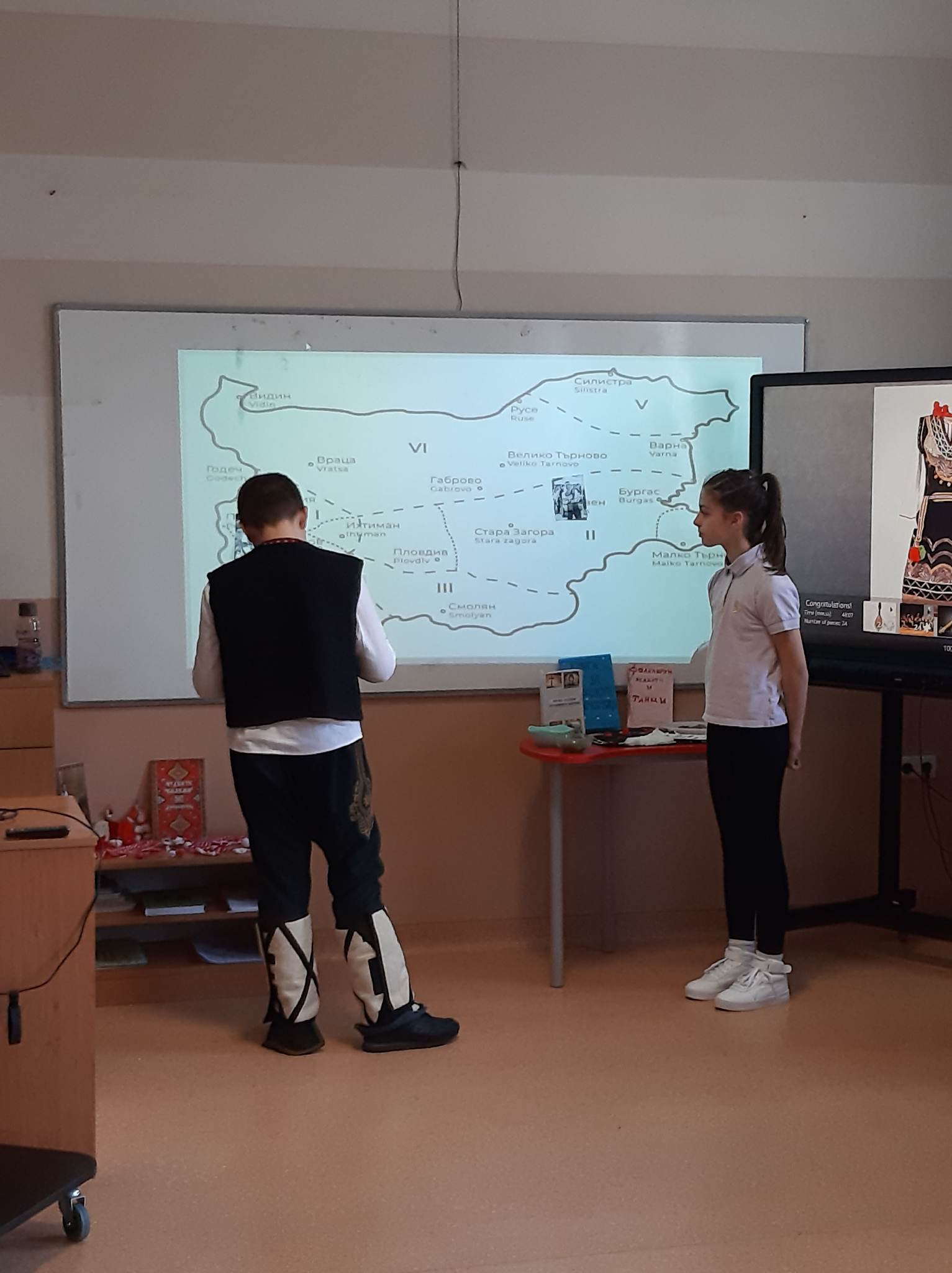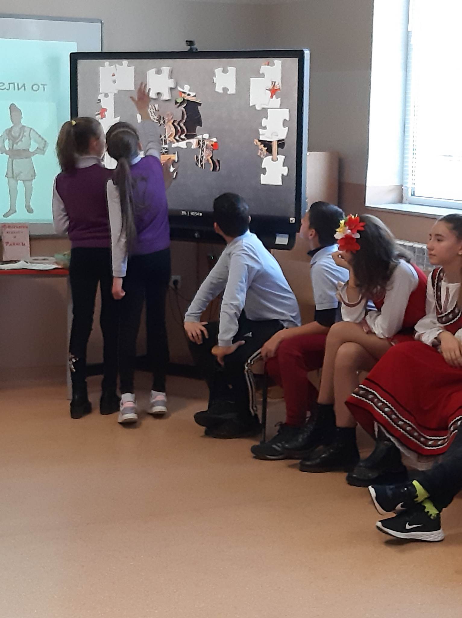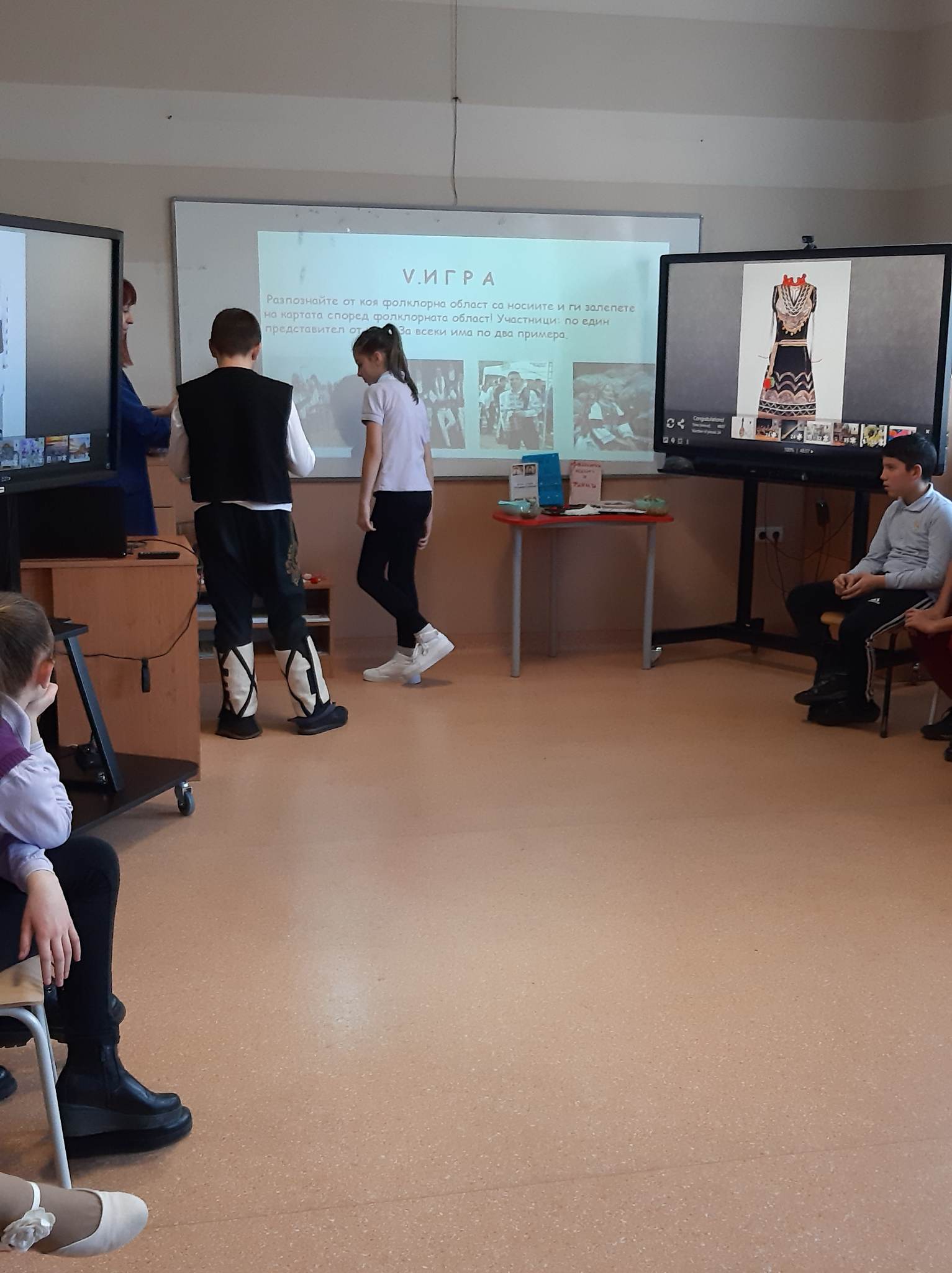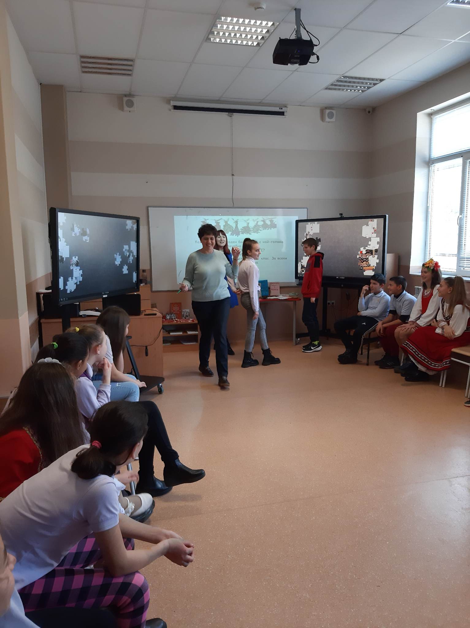 В състезателната част от урока учениците от двата класа разпознаваха билки, подреждаха пъзели с изображения на тракийска и шопска народни носии, свързваха ястия, типични за посочените празници…