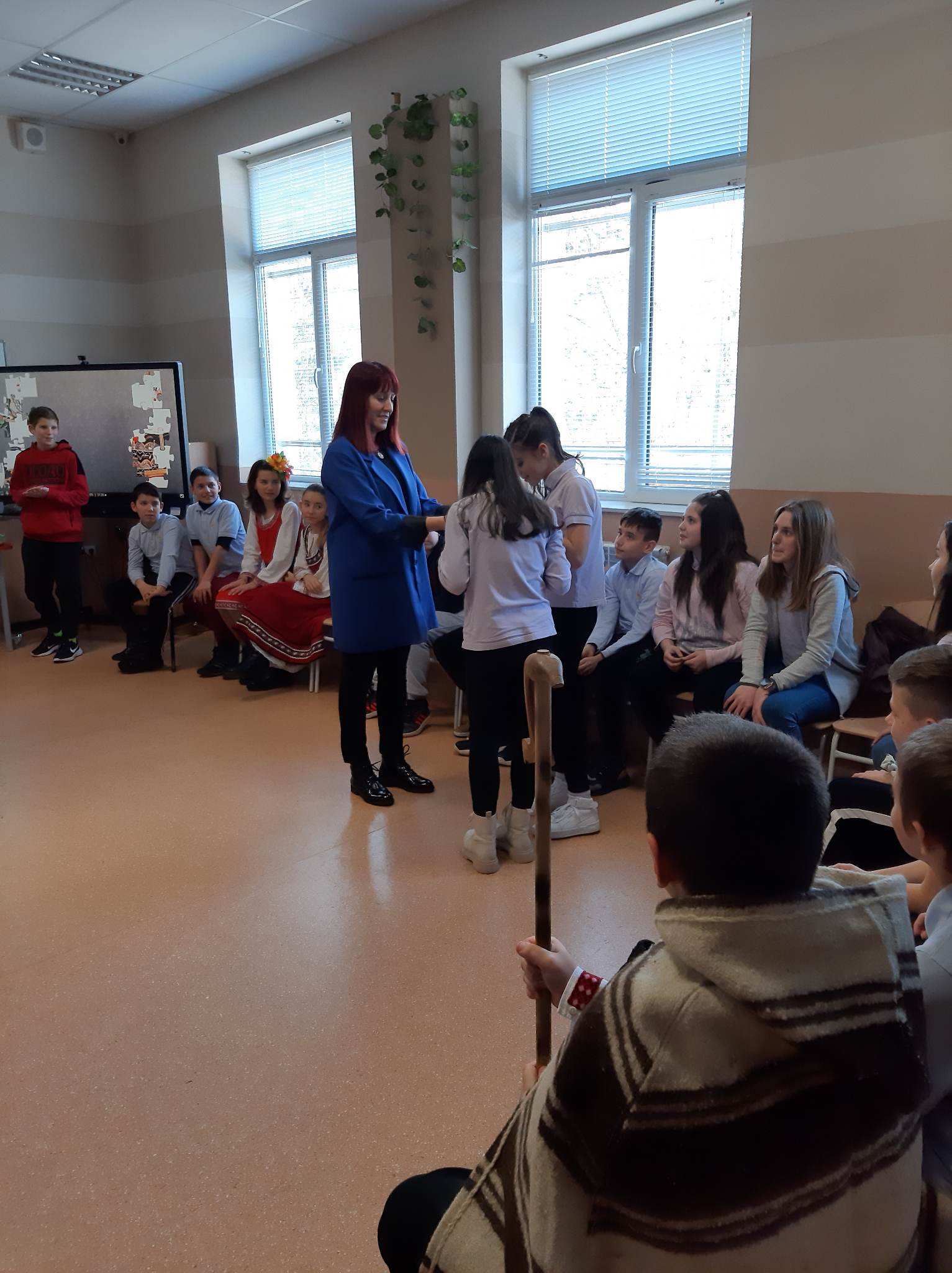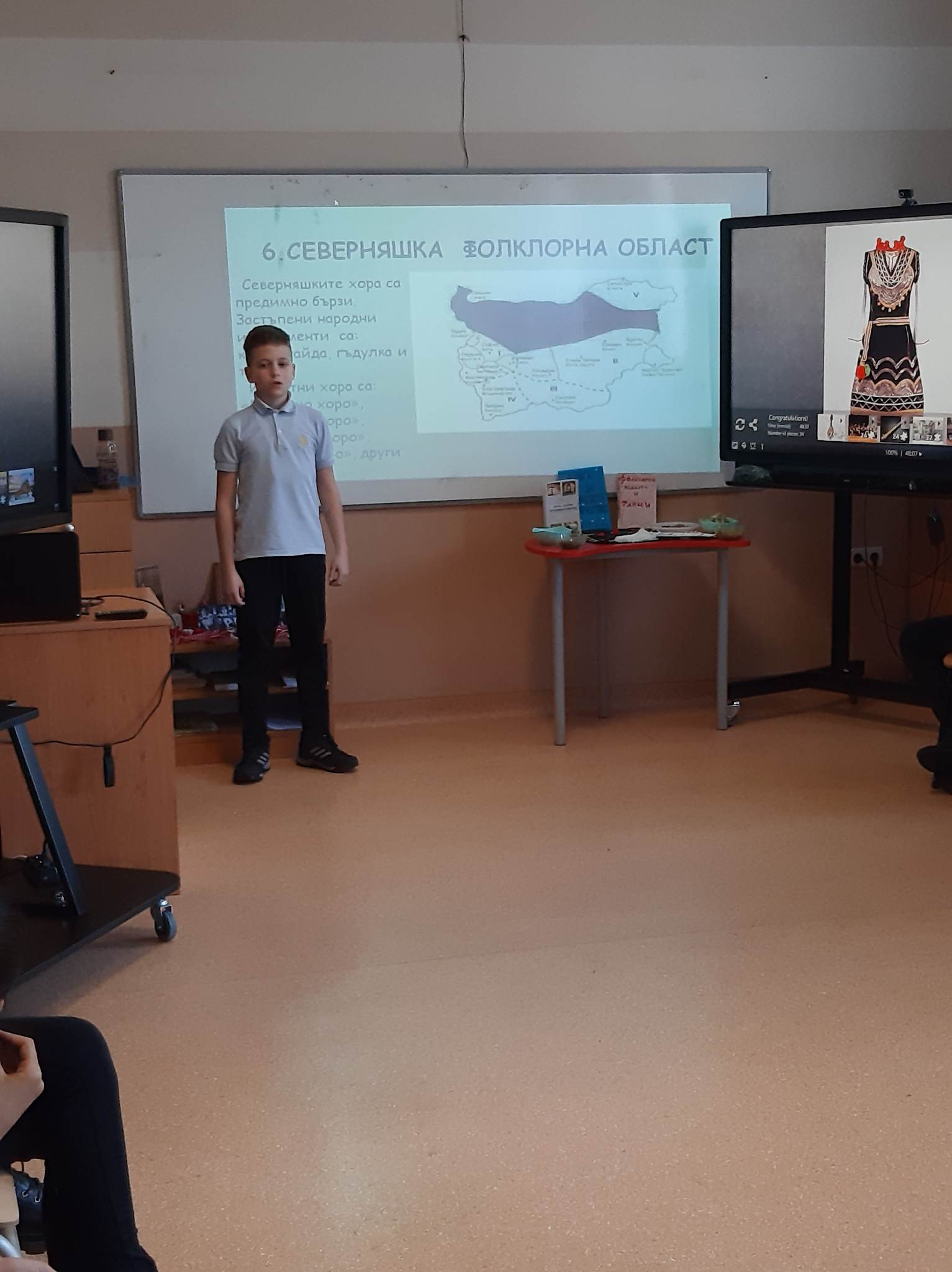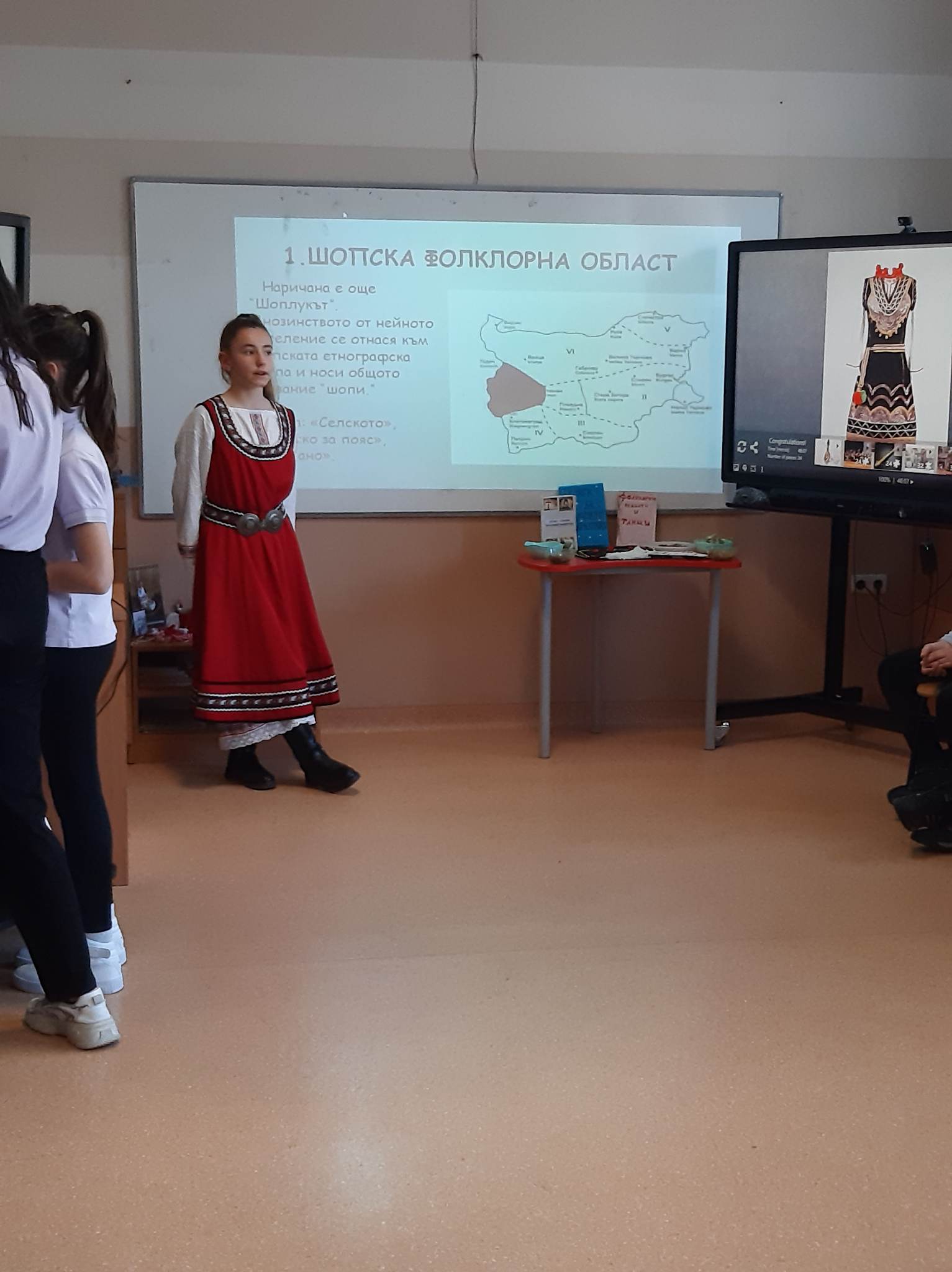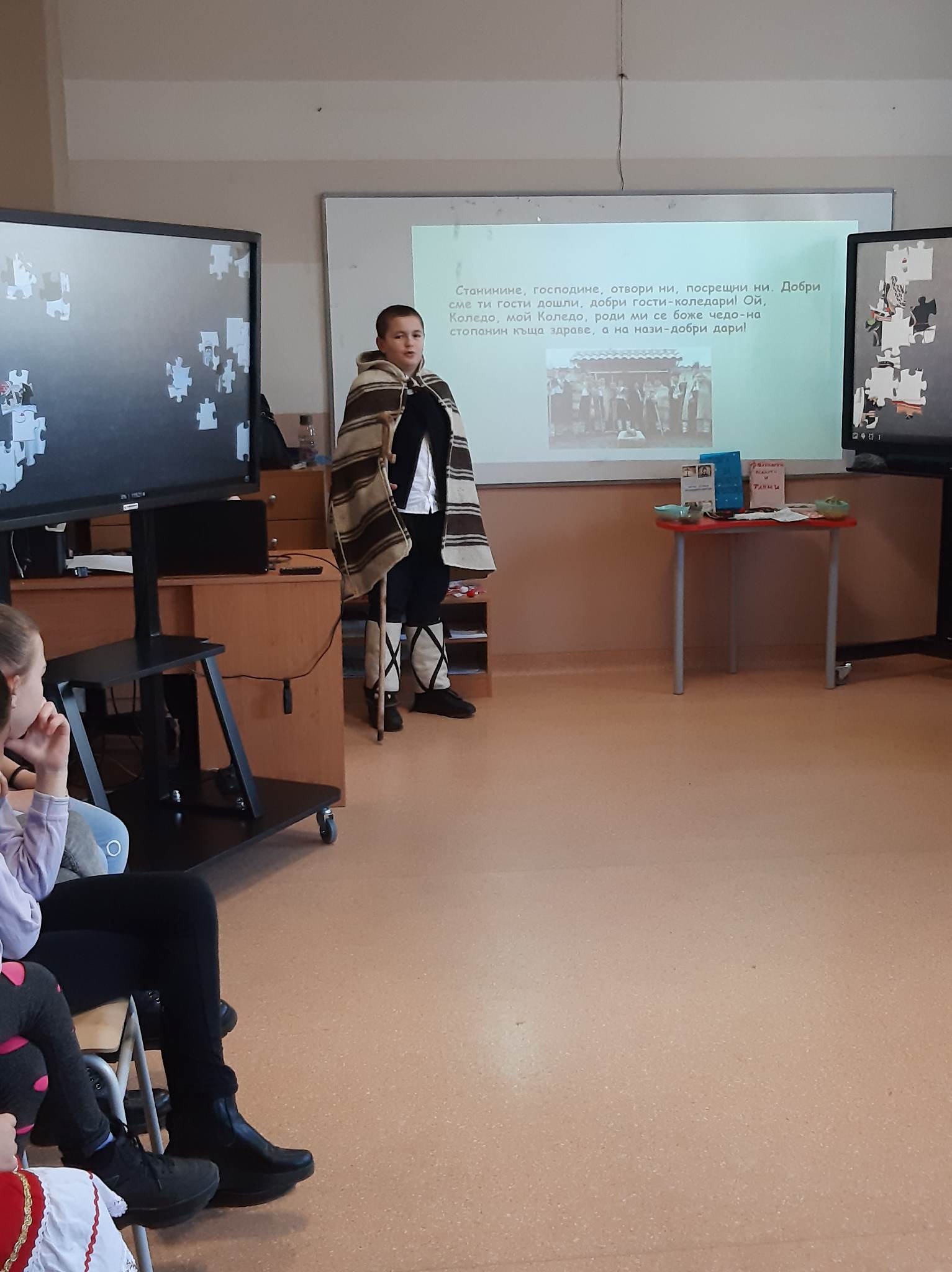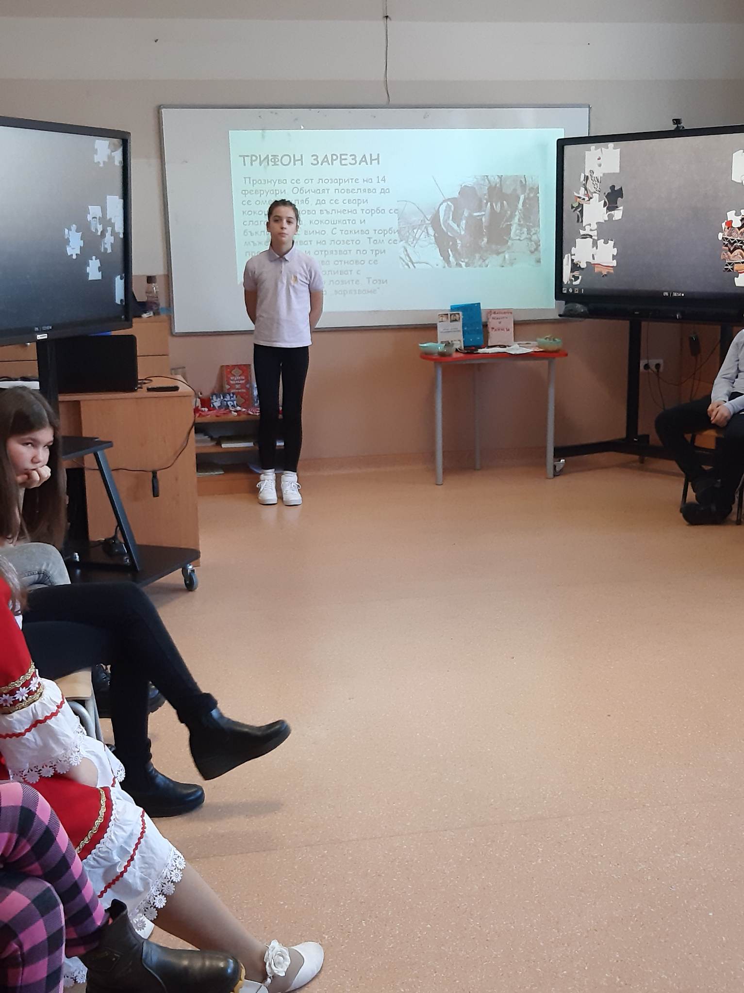 В състезателната част от урока учениците от двата класа разпознаваха билки, подреждаха пъзели с изображения на тракийска и шопска народни носии, свързваха ястия, типични за посочените празници…