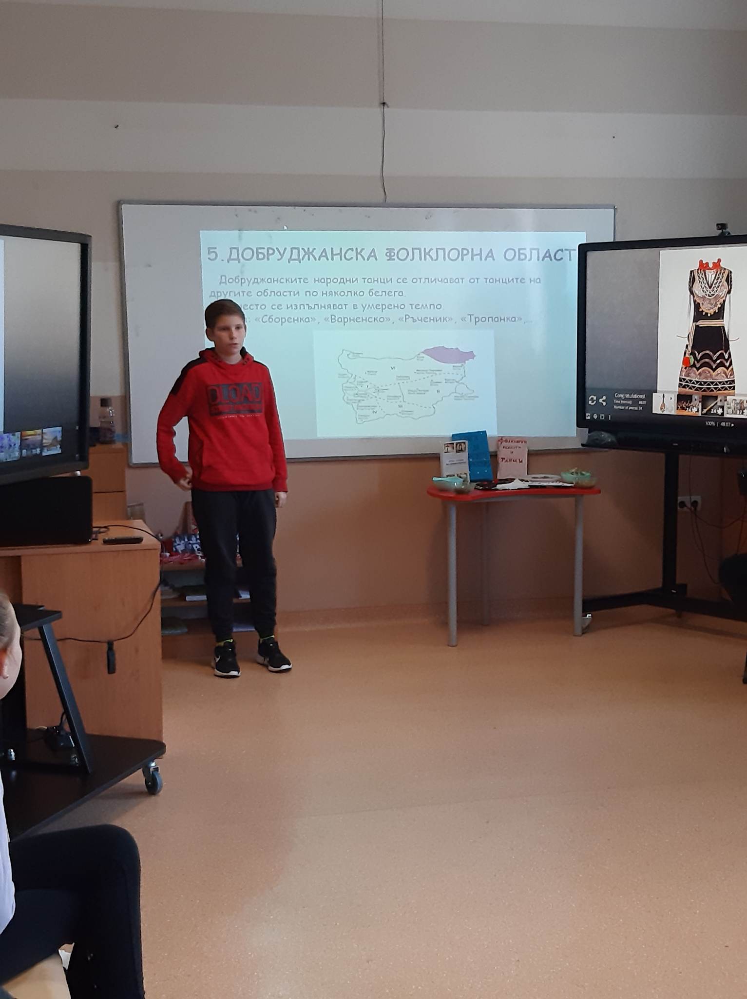 Участниците в трите екипа, заедно с ръководителите Дора Балъкчиева и Невена Василева, представиха информация за пролетните, лятно – есенните и за зимните празници и обичаи. Четвъртият екип запозна присъстващите с фолклорните области и танците на българите.