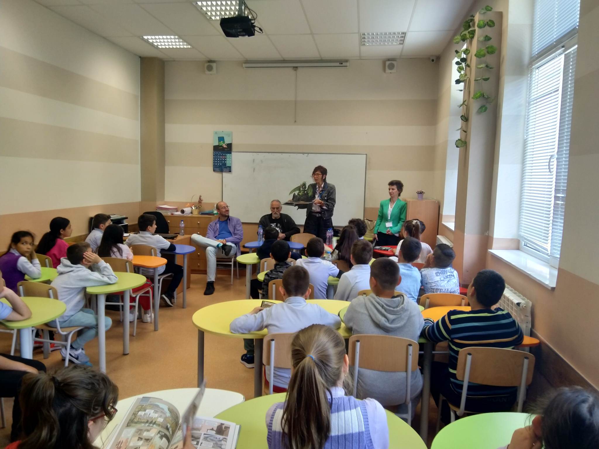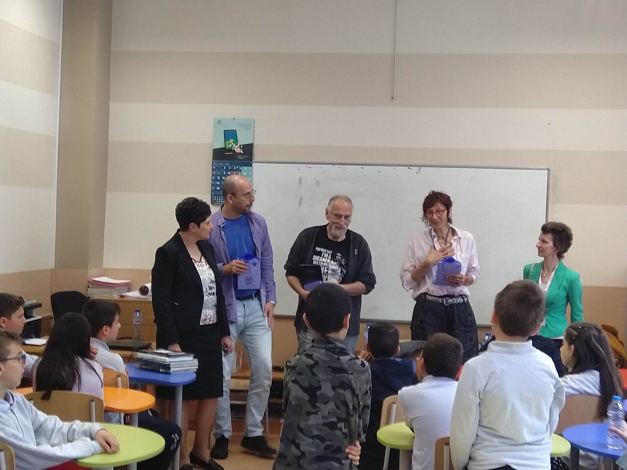 В седмицата на 25-тия Национален фестивал на детската книга учениците от IV “В” и III “А” се срещнаха с писателя Марин Трошанов и художника Петър Станимиров, автор и илюстратор на образователната комиксова поредица “Роботът Чапек”.