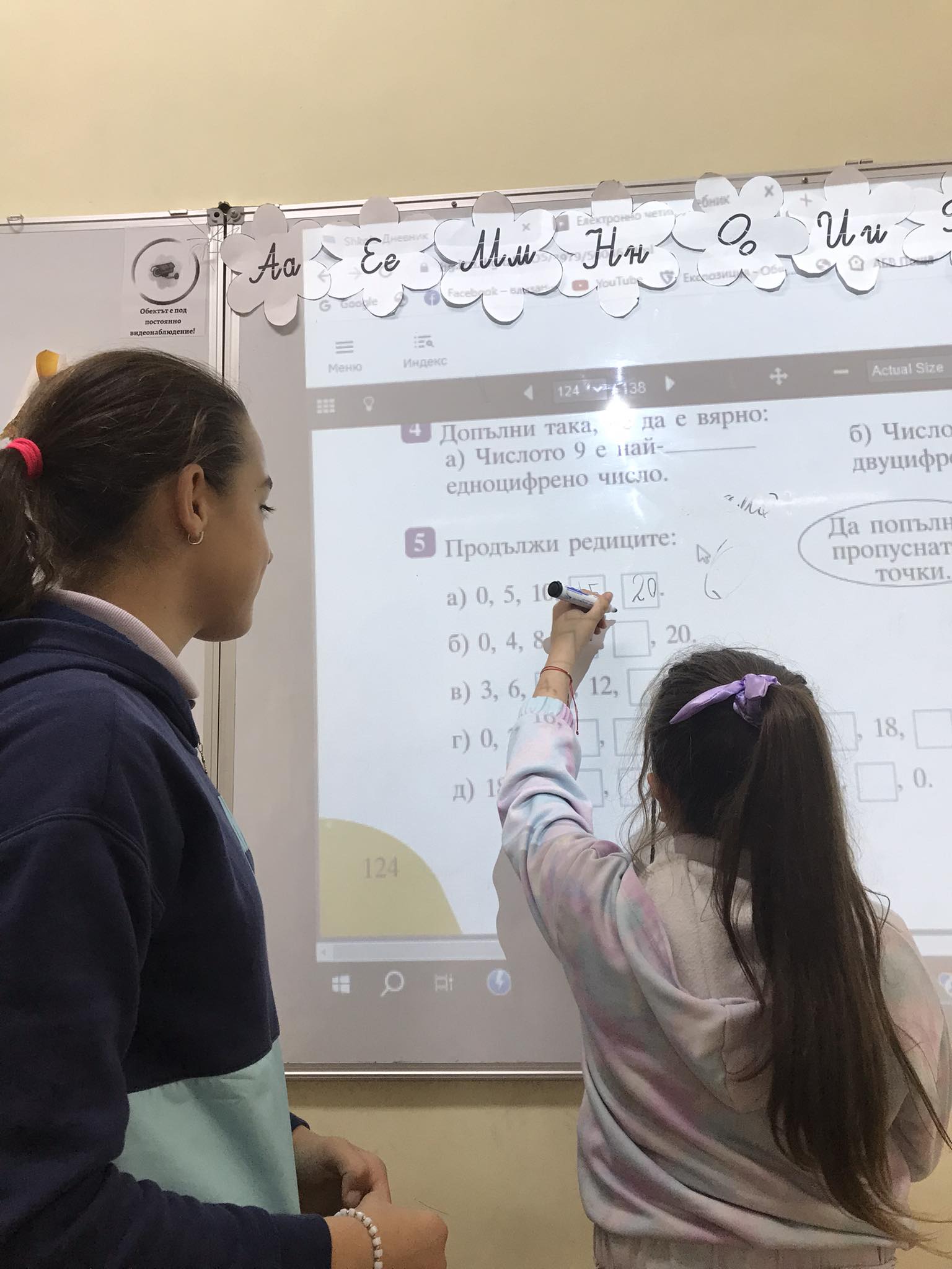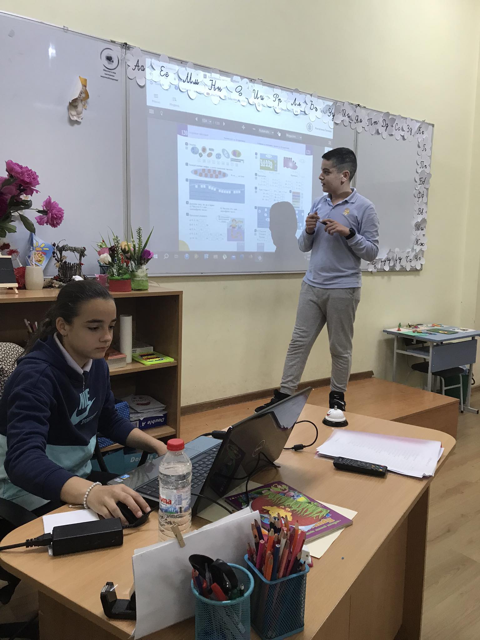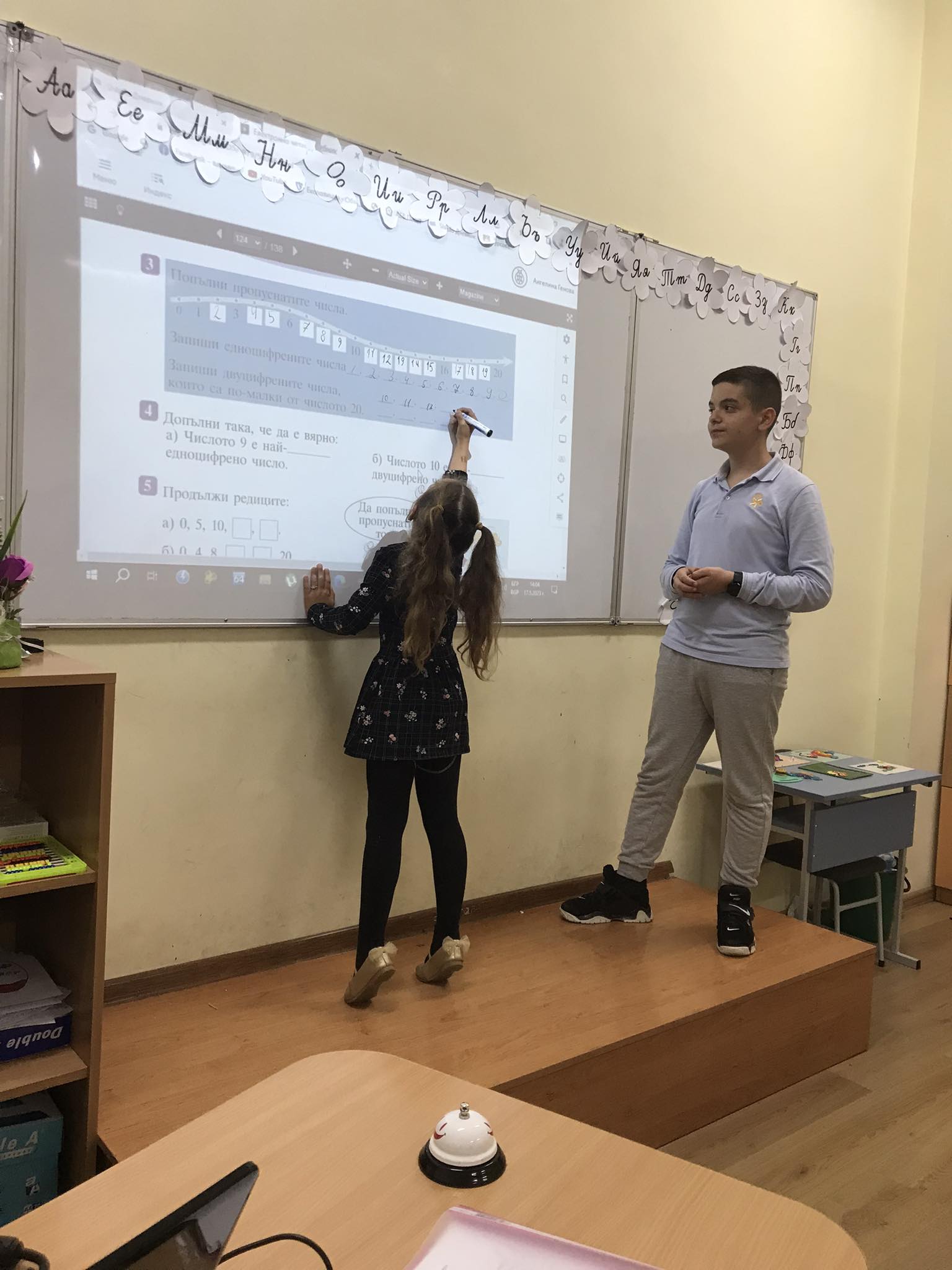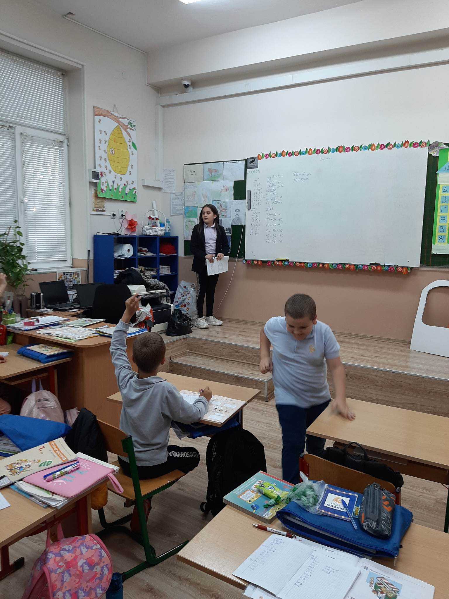 Учениците от пети клас – Даниел Генчев, Никол Николова, Анелия Иванова и Грета Стоянова участваха в преговорните уроци по математика в първи клас.