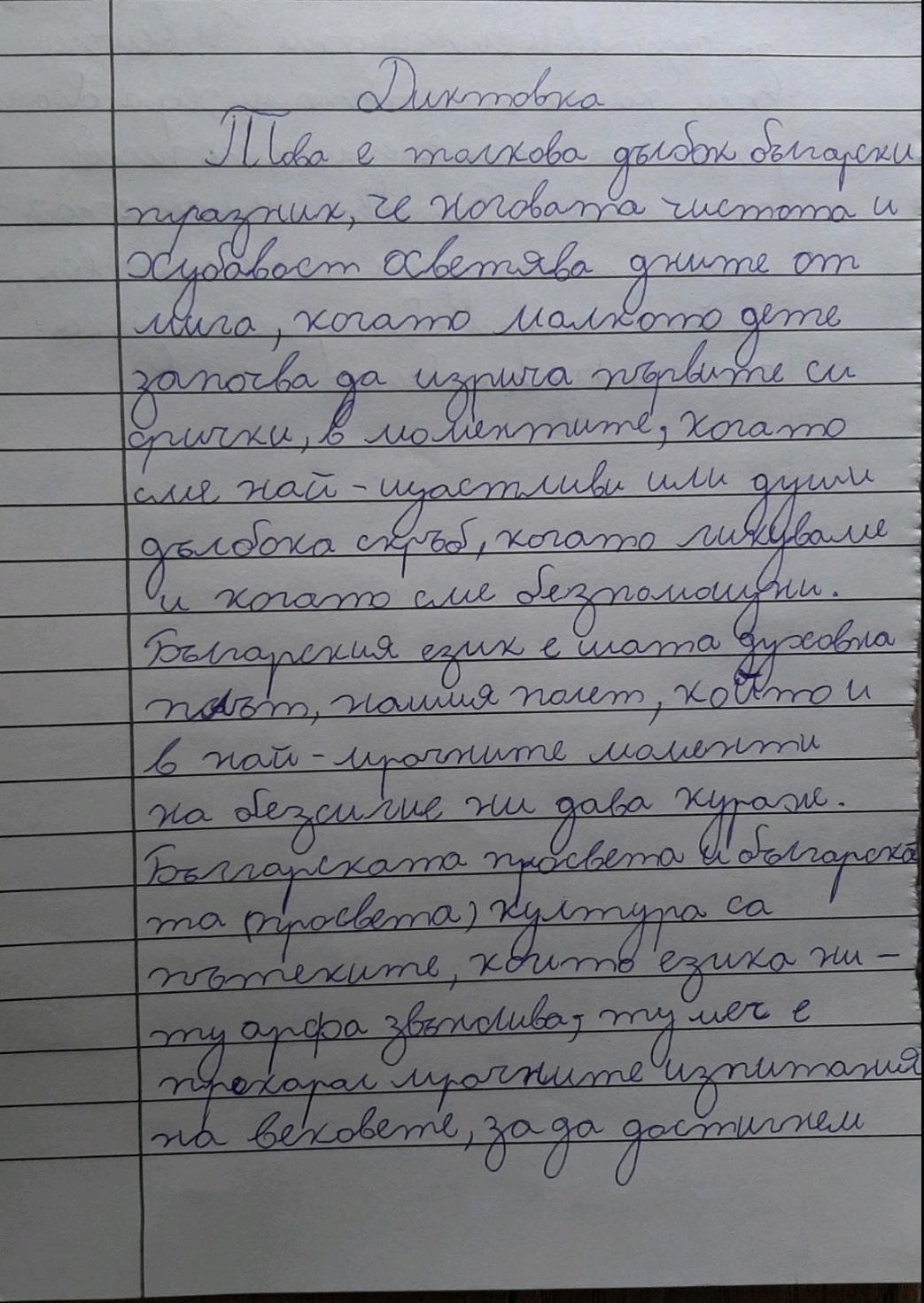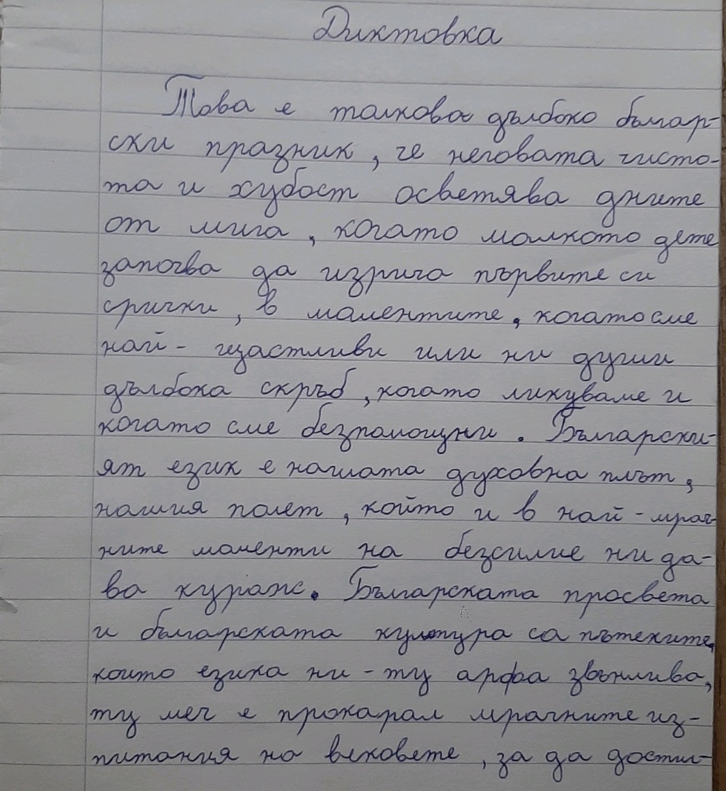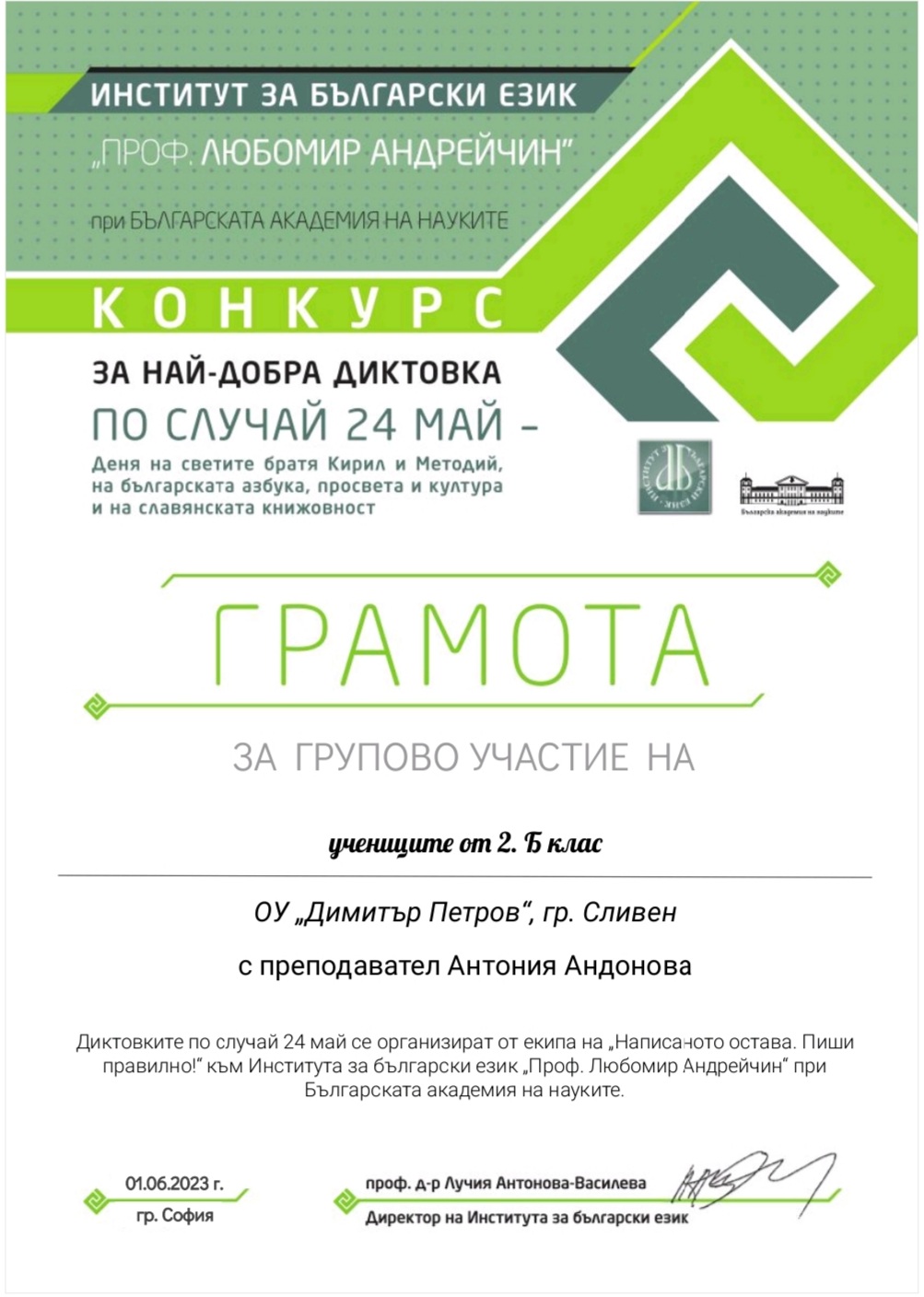 Учениците от II „Б“ клас при Основно училище ,,Димитър Петров’’ за първи път се включиха в конкурс за най – добра диктовка, организиран от Институтът за български език „Проф. Любомир Андрейчин“ при Българската академия на науките по случай 24 май.