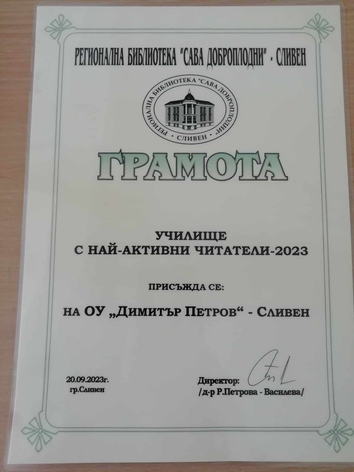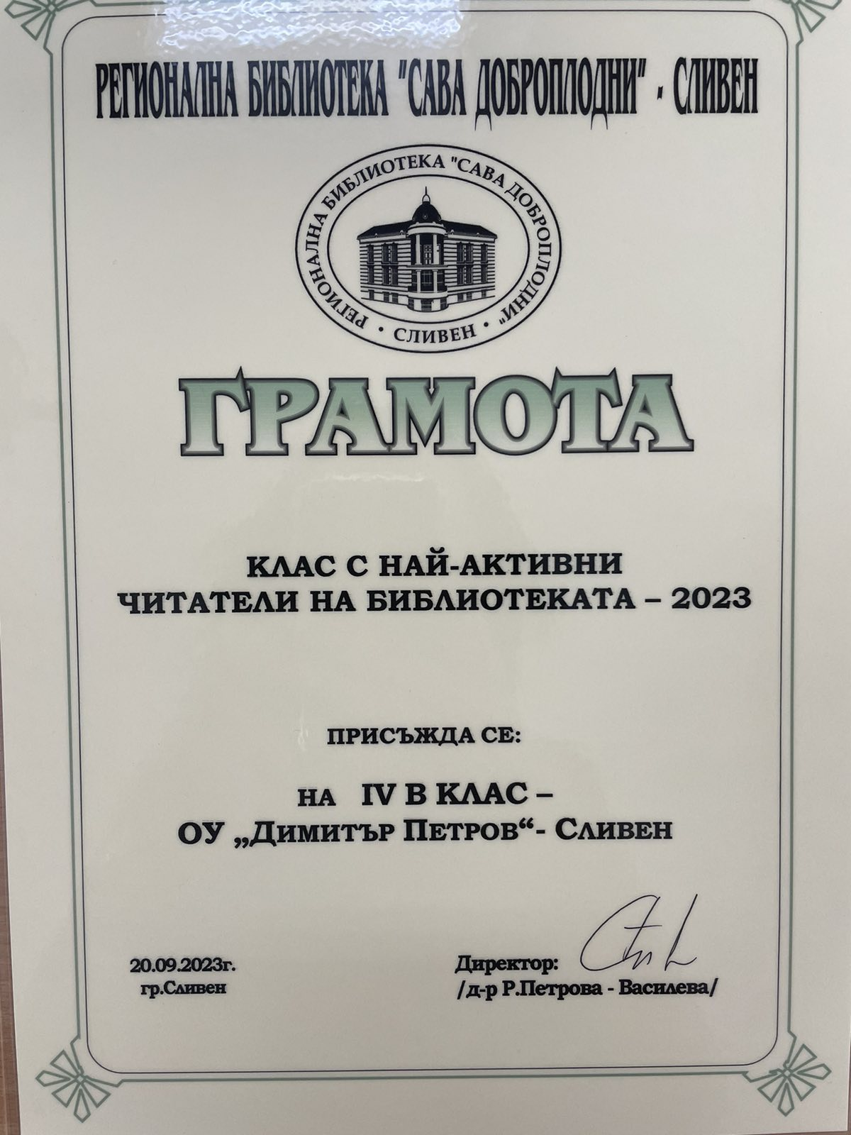 Грамота за училище с най – активни читатели беше връчена на г-жа Маргарита Иванова – директор на ОУ “Димитър Петров”