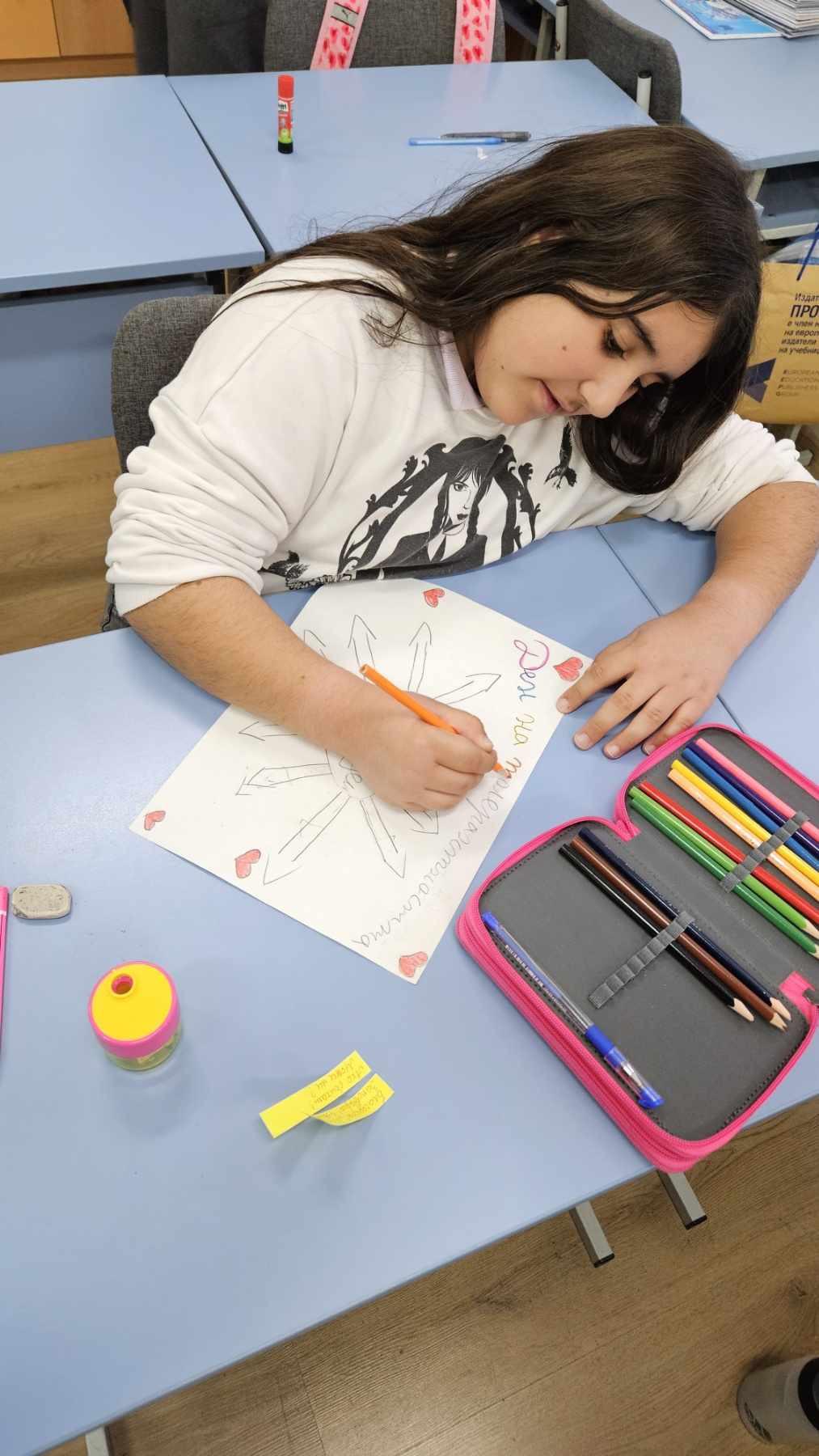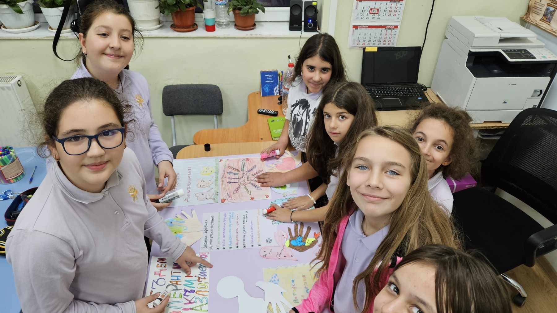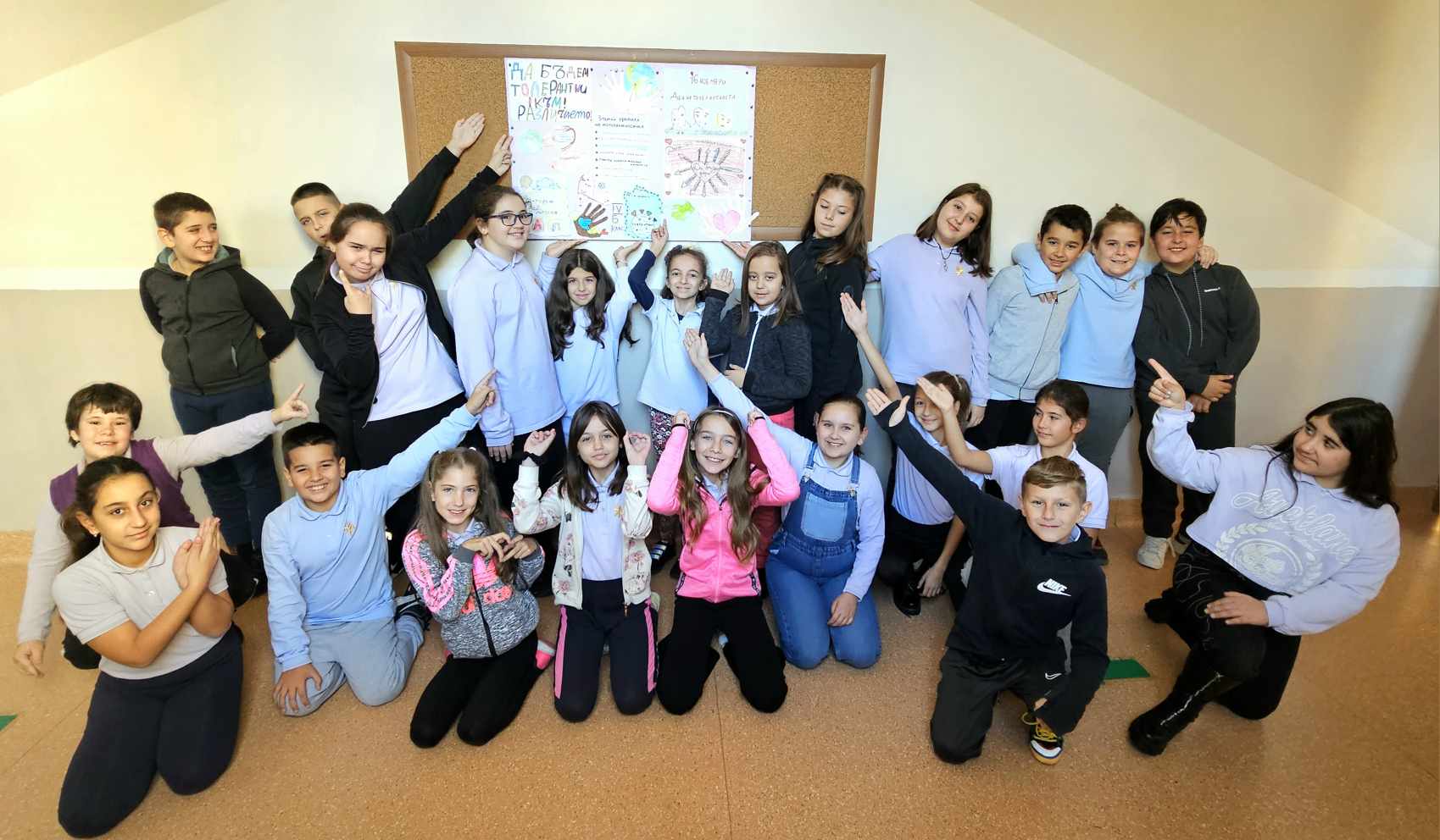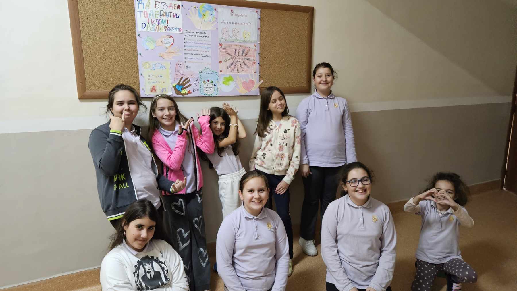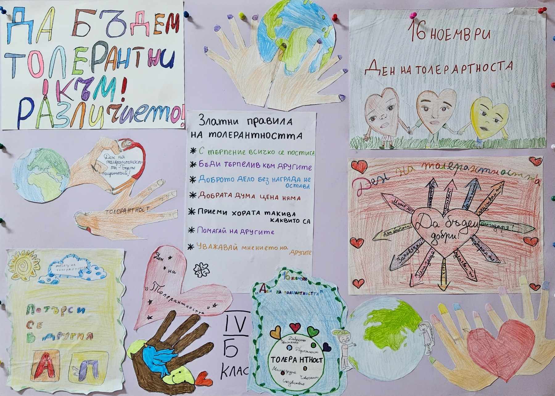 Учениците от IV ,,Б” клас изработиха табло на толерантността и с него изразиха мнението си и отправиха своето послание за днешния ден, а именно – “Не е лесно да приемаме различията, но не е невъзможно, нужно е само да го пожелаем.”