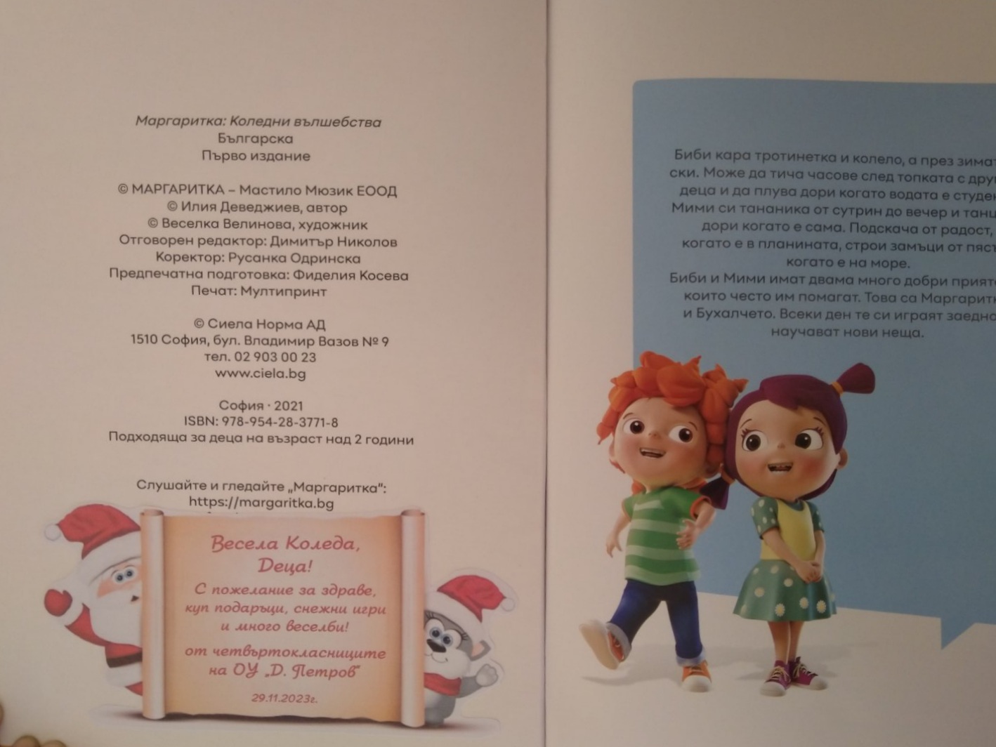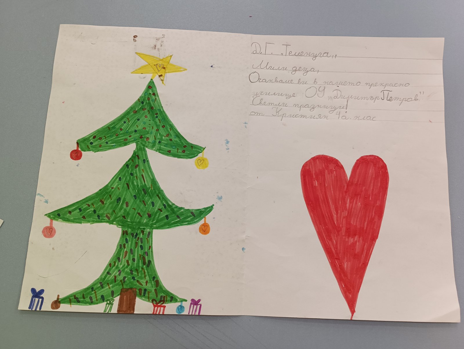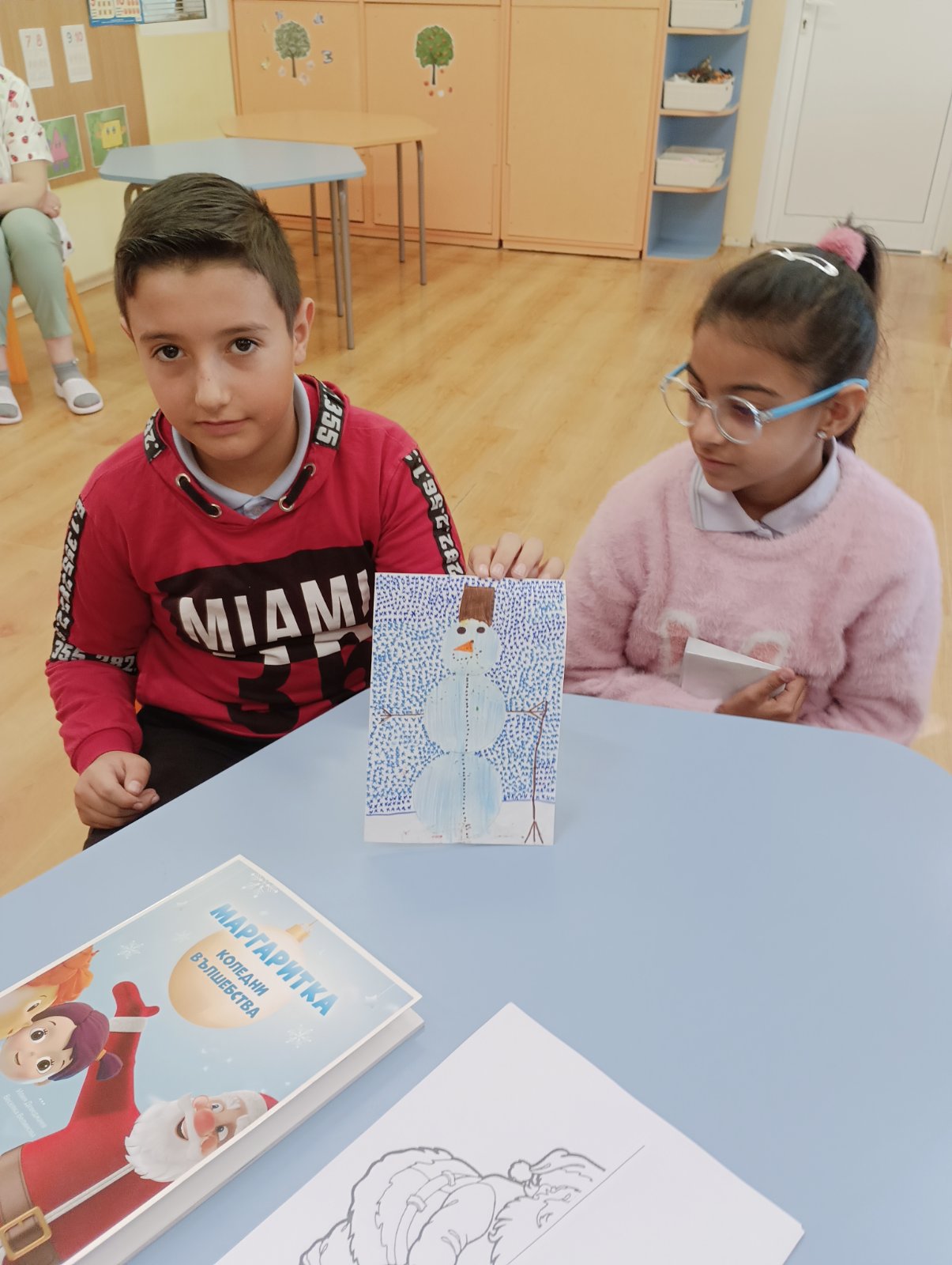 За групата на бъдещите първокласници, учителите г-жа Димова и г-жа Вачкова, бяха подготвили малък подарък – книжка с коледни истории и ръчно направена картичка по случай предстоящите празници.