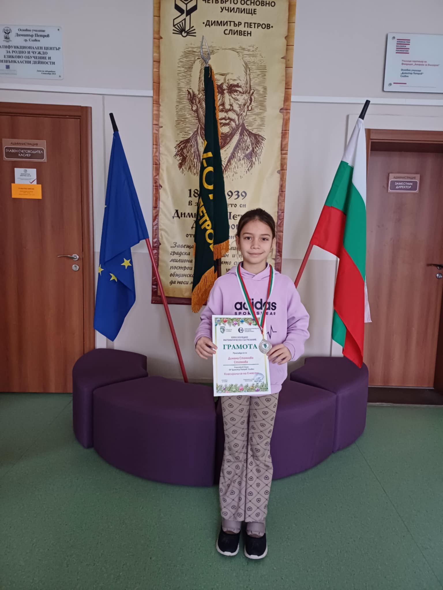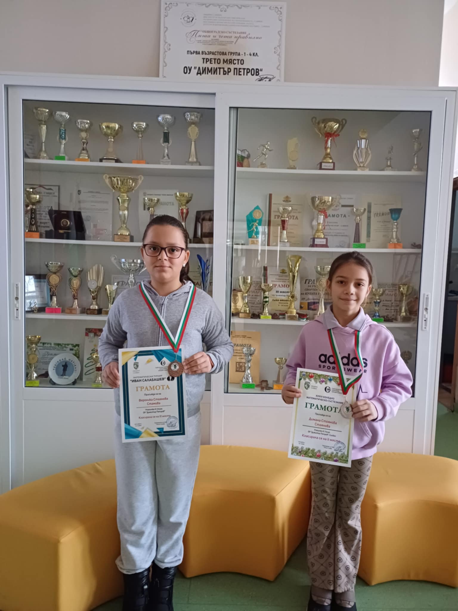 II – ро място – Димана Стоянова Стоянова 3 ,,В” клас, II – ро място – Яна Станимирова Желева 4 ,,В” клас,  поощрителна грамота за отлично представяне получи Александър Красимиров Радулов – 1 ,,А” клас и Габриела Станимирова Иванова 2 ,,Б” клас.