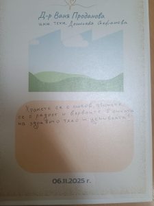 Срещата с д-р Проданова не беше само образователна, но и вдъхновяваща. С топлота и ентусиазъм тя мотивира децата да мечтаят смело и да вярват в себе си. Говорихме за поставяне на цели, упоритост и вяра в собствените сили – ценности, които са в основата на проекта ни „ Приятел с мисия“.