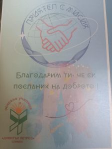 „Приятел с мисия“ се реализира благодарение на инициативата и подкрепата на училищната общност. Изказваме сърдечна благодарност към родители и партньори, които допринасят с ентусиазъм, време и усилия за неговото осъществяване. Всяка среща се превръща в ценен урок по доброта, съпричастност и личностно развитие.